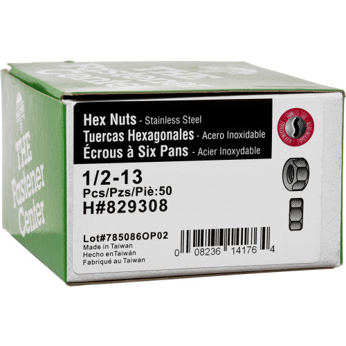 Durable Hillman stainless steel hex nuts for 1/2"-13 USS coarse-thread bolts and rods. Corrosion‑resistant 18-8 stainless offers reliable hold for general-purpose fastening indoors or out.