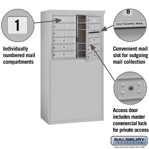 This free-standing mailbox unit features 10 doors and is constructed from heavy-duty aluminum with a durable powder-coated finish. Designed for private access, it is ideal for indoor and outdoor use, offering secure and convenient mail storage.