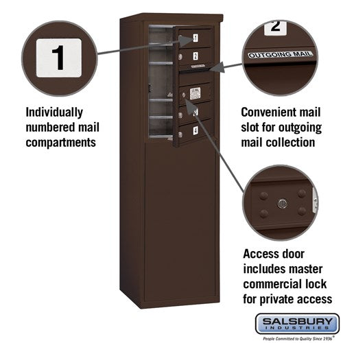 This free-standing mailbox unit combines robust functionality with sleek design, making it a perfect addition to any environment. Its bronze finish and durable construction exude sophistication while ensuring long-lasting performance. Place it in a corporate mail center or a private postal area to enhance both utility and aesthetic appeal. Truly, this mailbox is a testament to the harmony of form and function.
