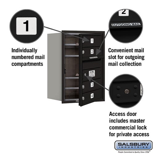 Outgoing Mail Compartment Includes master commercial lock access door and mail slot with weather protection hood
