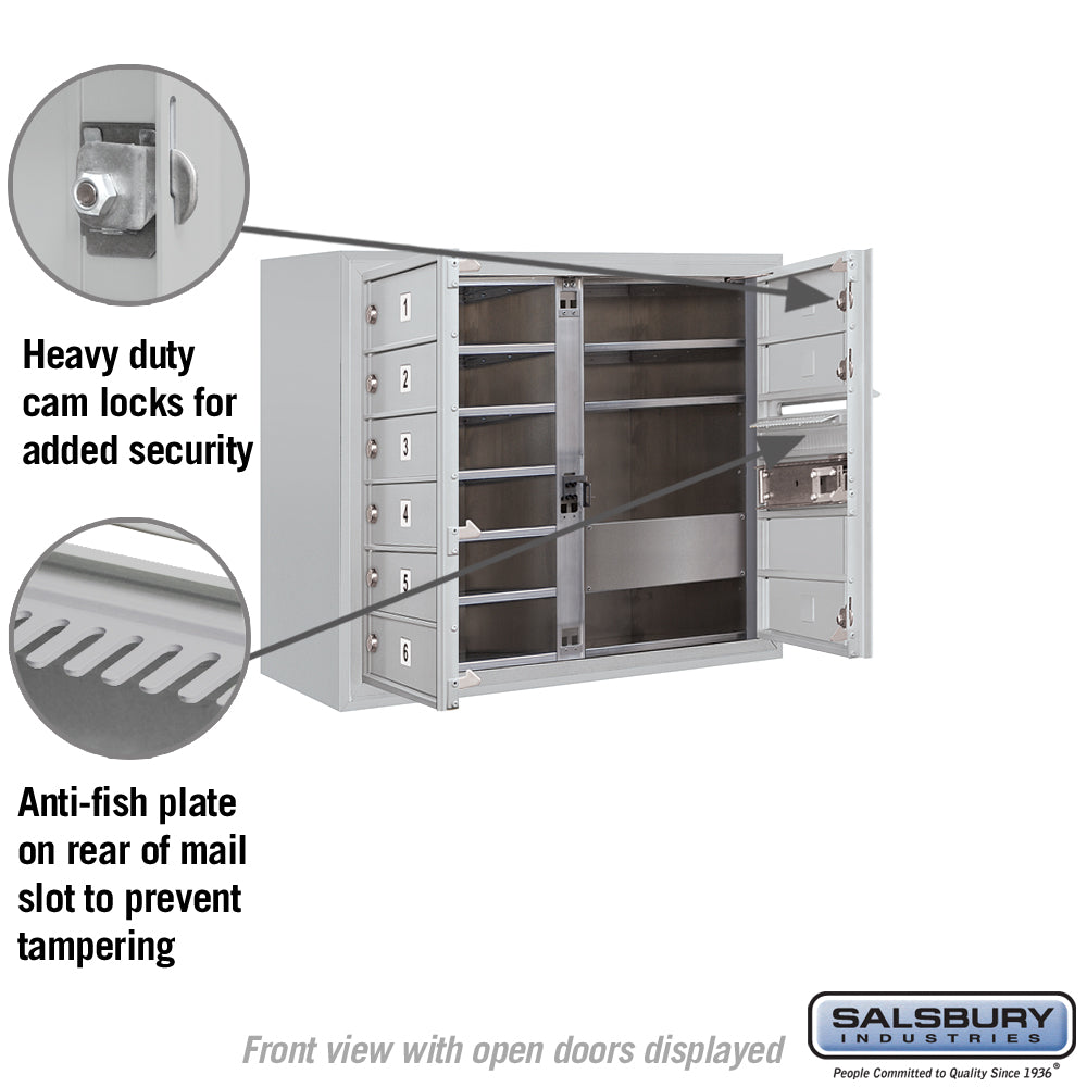This 6 Door High Surface Mounted 4C Horizontal Mailbox is designed for private access and features a durable aluminum construction with a powder-coated finish. Ideal for indoor and outdoor use, it offers secure mail storage with heavy-duty locks and ADA compliance.