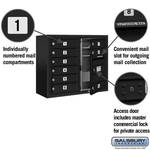 This 6-door surface-mounted mailbox is designed for private access and features a durable powder-coated finish, heavy-duty aluminum construction, and front-loading access. Ideal for indoor and outdoor use, it provides secure mail storage with a master commercial lock.