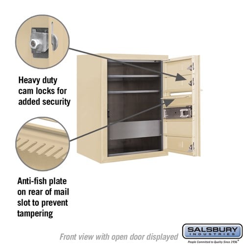 Outgoing Mail Compartment Includes master commercial lock access door and mail slot with weather protection hood