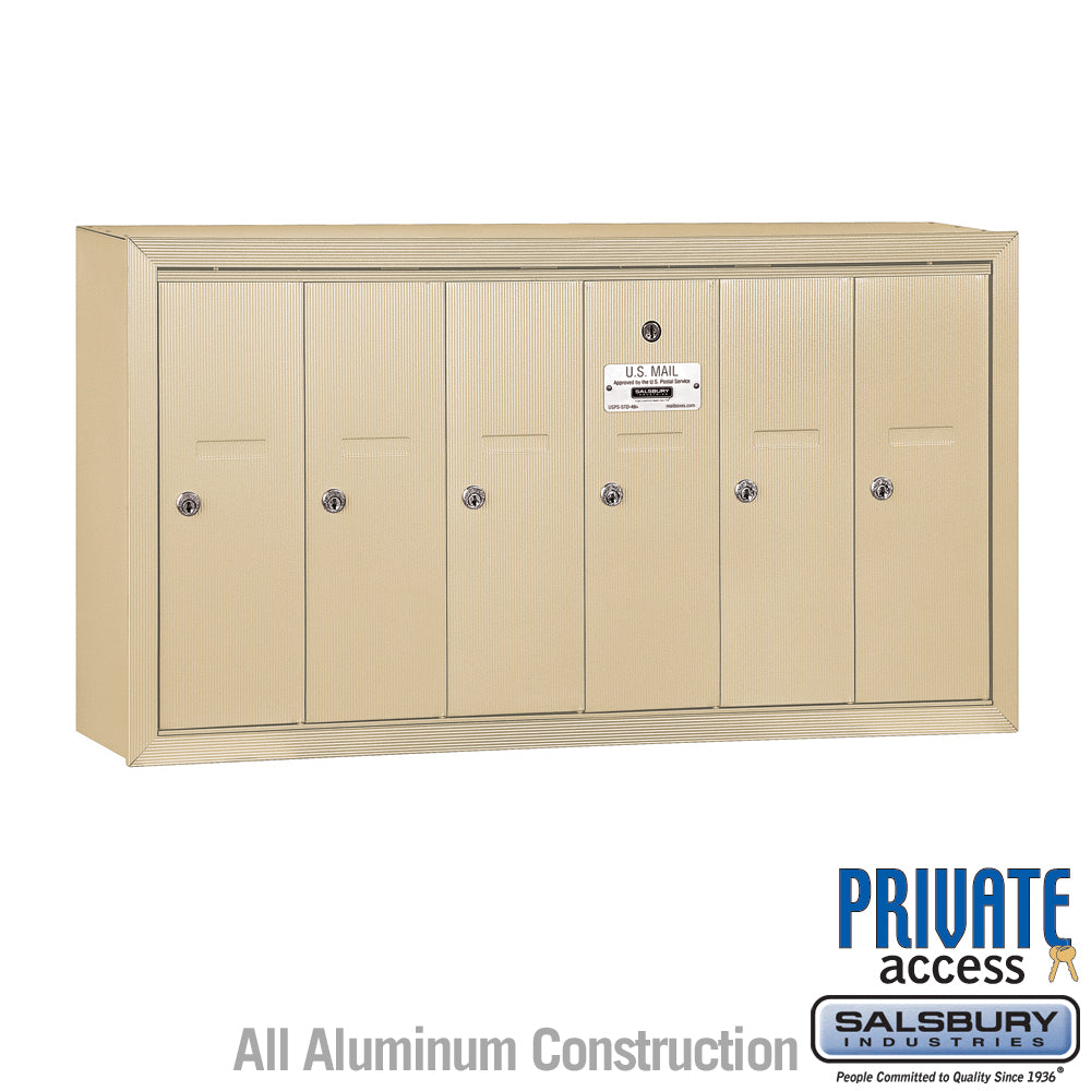 This 6-door vertical mailbox is designed for private access and surface mounting, featuring durable aluminum construction with a sandstone powder-coated finish. Ideal for secure mail storage in various settings.