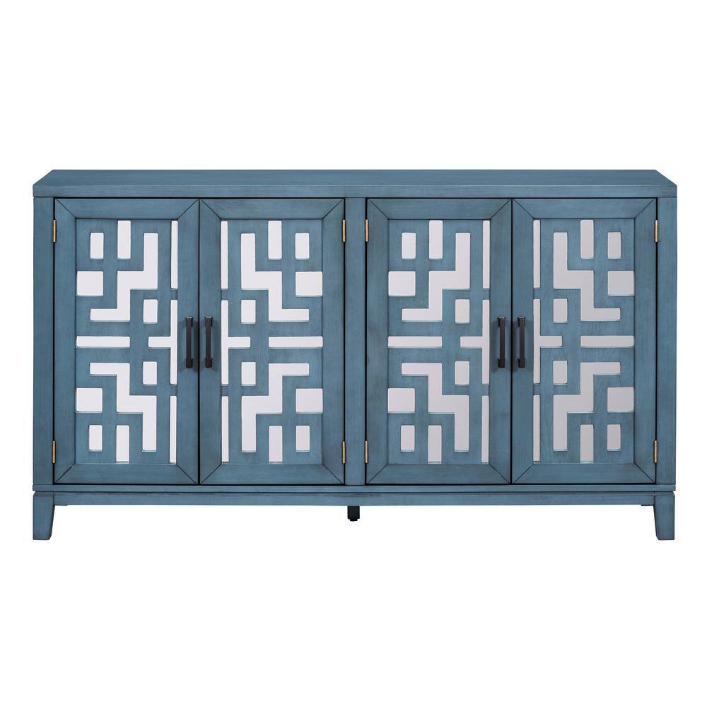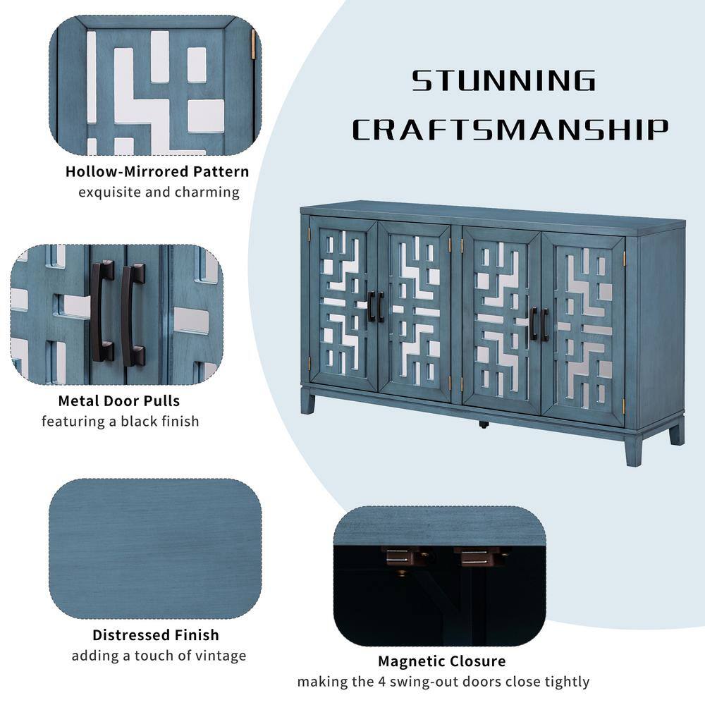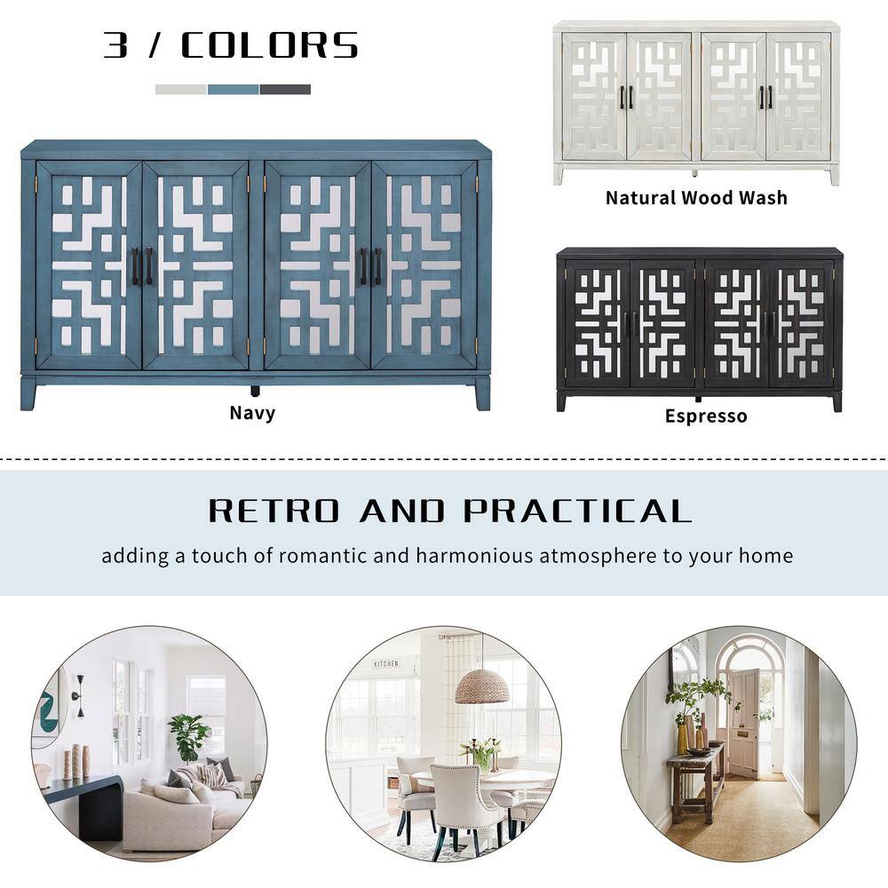 Evoke the spirit of seaside cottages and rustic joy with the Navy Retro Acacia Wood Kitchen Sideboard. Its mirrored trellis doors add an entrancing reflective quality, capturing elegance through a delicate pattern. Pair this sideboard with soft linen textiles and antique brass accents to create an intimate corner of refined taste. Essential for both storage and style, this piece becomes the artful heart of your communal spaces.