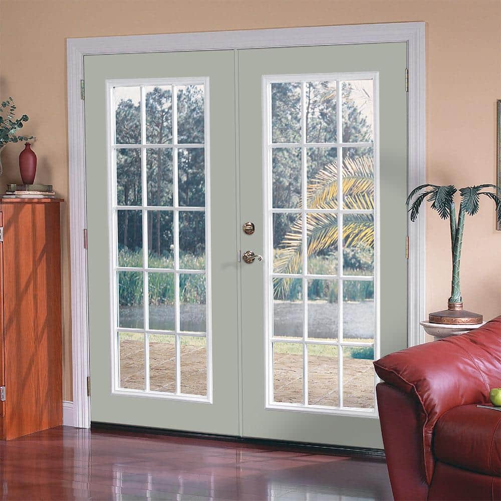 This Masonite prehung French patio door pairs durable steel construction with clear 15-lite glass to flood interiors with light while boosting security. Preassembled with brickmold, wood frame, aluminum sill, and weatherstripping, it’s painted in Silver Cloud and built for energy efficiency with Low-E, insulated glass.