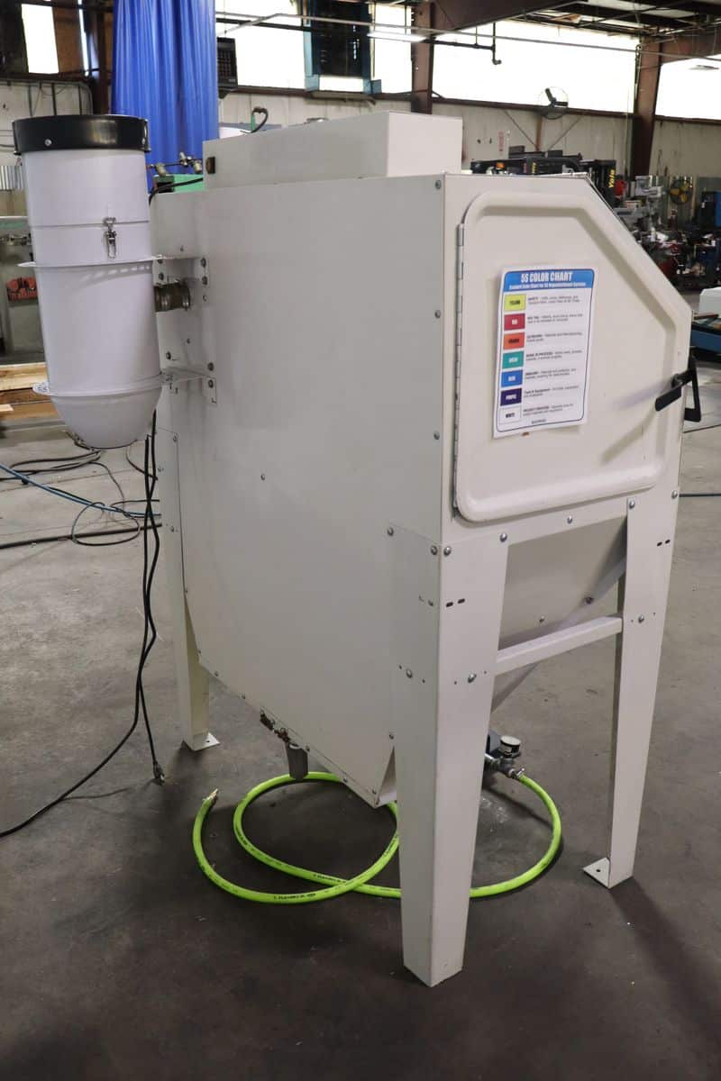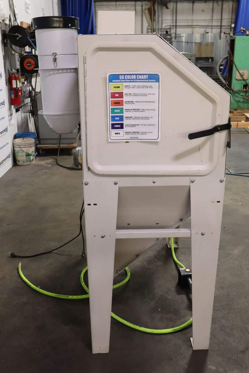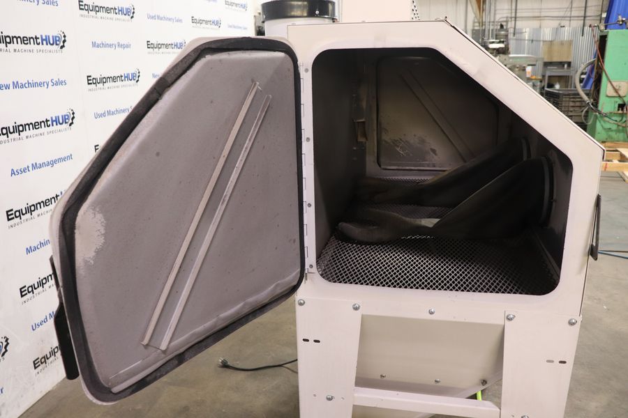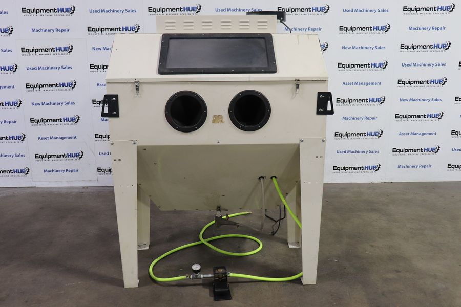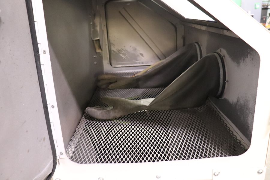 Heavy-duty blasting cabinet designed for efficient surface preparation and part cleaning. Includes integrated dust reclaimer, work light, gun and gloves for a cleaner workspace and better visibility. Ideal for shops needing enclosed abrasive blasting with consistent air performance.