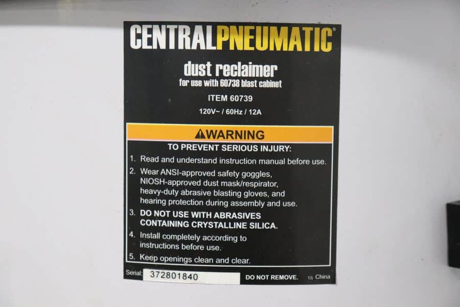 Q: Is dust control included? A: Yes, it includes the Central Pneumatic 60739 dust reclaimer to help keep the cabinet clear and improve visibility.