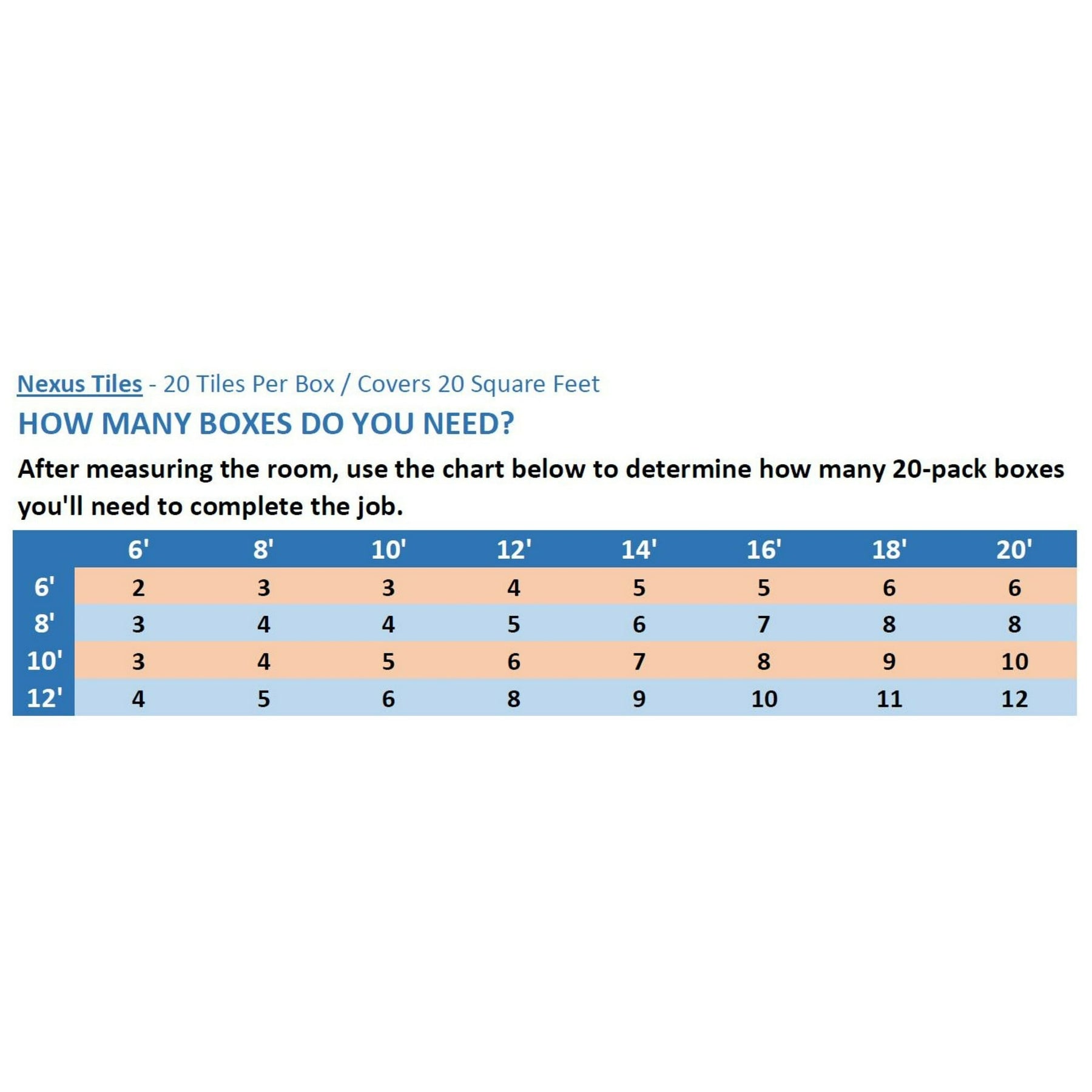 A: Each box covers 20 sq ft; divide your room’s square footage by 20 and round up.