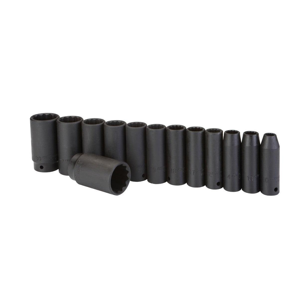 This high quality deep impact socket set is built from rugged chromium molybdenum to withstand high force. Ideal for reaching nuts on long studs. Features include high visibility, laser-etched markings to make size selection easy and quick. The impact socket set contains the most popular sizes for most automobile engines and transmissions.