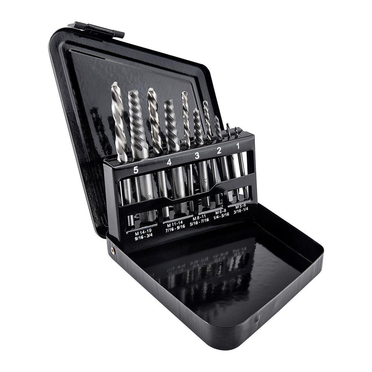 - Set includes: Drill bit sizes (five total): 5/64 in., 1/8 in., 5/32 in., 1/4 in., 19/64 in., Extractor sizes (five total): #1 to #5