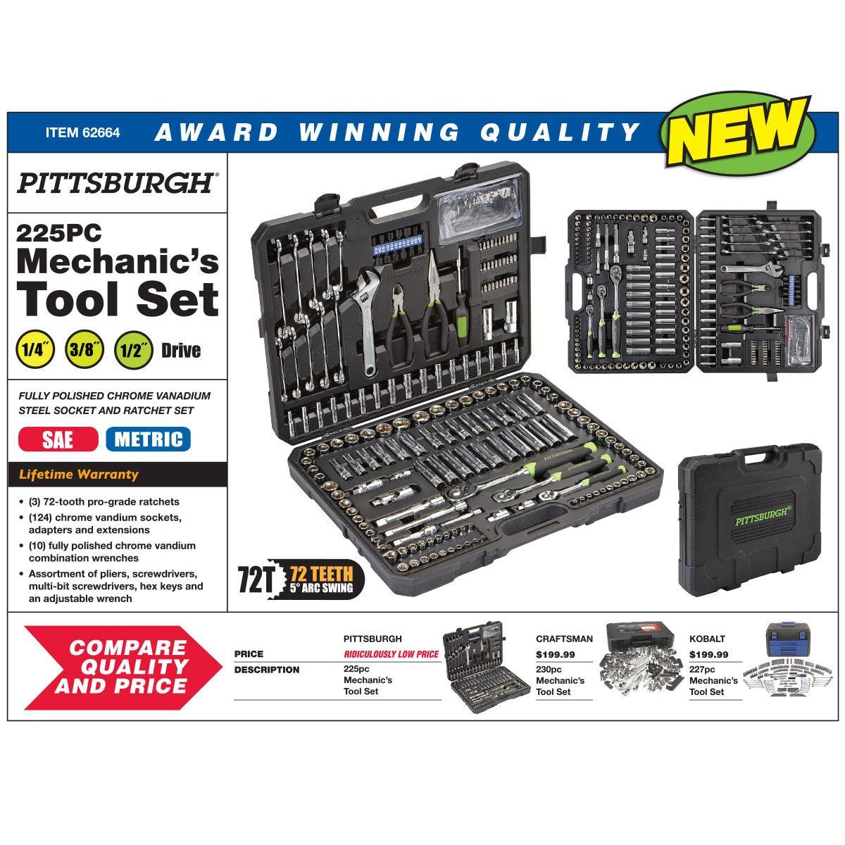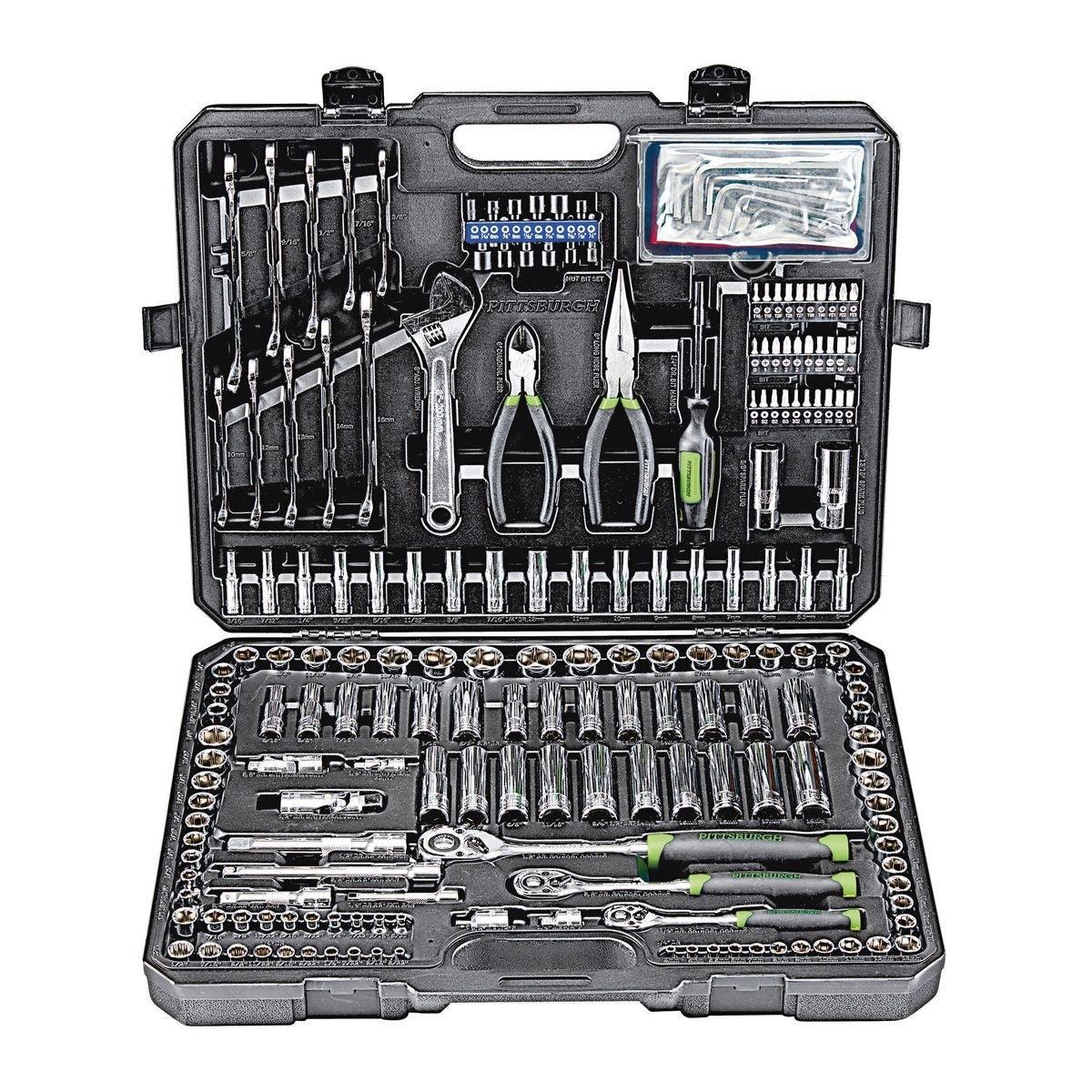 This high quality mechanic's tool set includes the most used automotive and mechanic's wrenches, pliers, ratchets, sockets and drivers in SAE and metric sizes. Constructed of durable chrome vanadium, this mechanic's tool set is built to last. Includes a custom storage case to keep tools organized and protected.