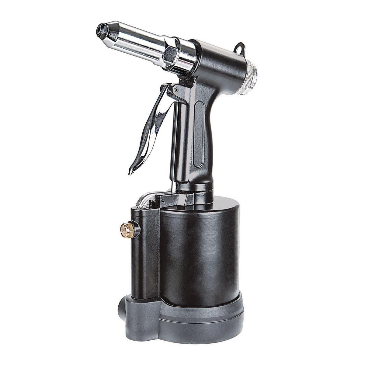 Powerful air-operated hydraulic riveter designed to set blind rivets fast. Includes interchangeable nosepieces for common rivet sizes and a safety cap to collect spent mandrels, ideal for shop or light production use.