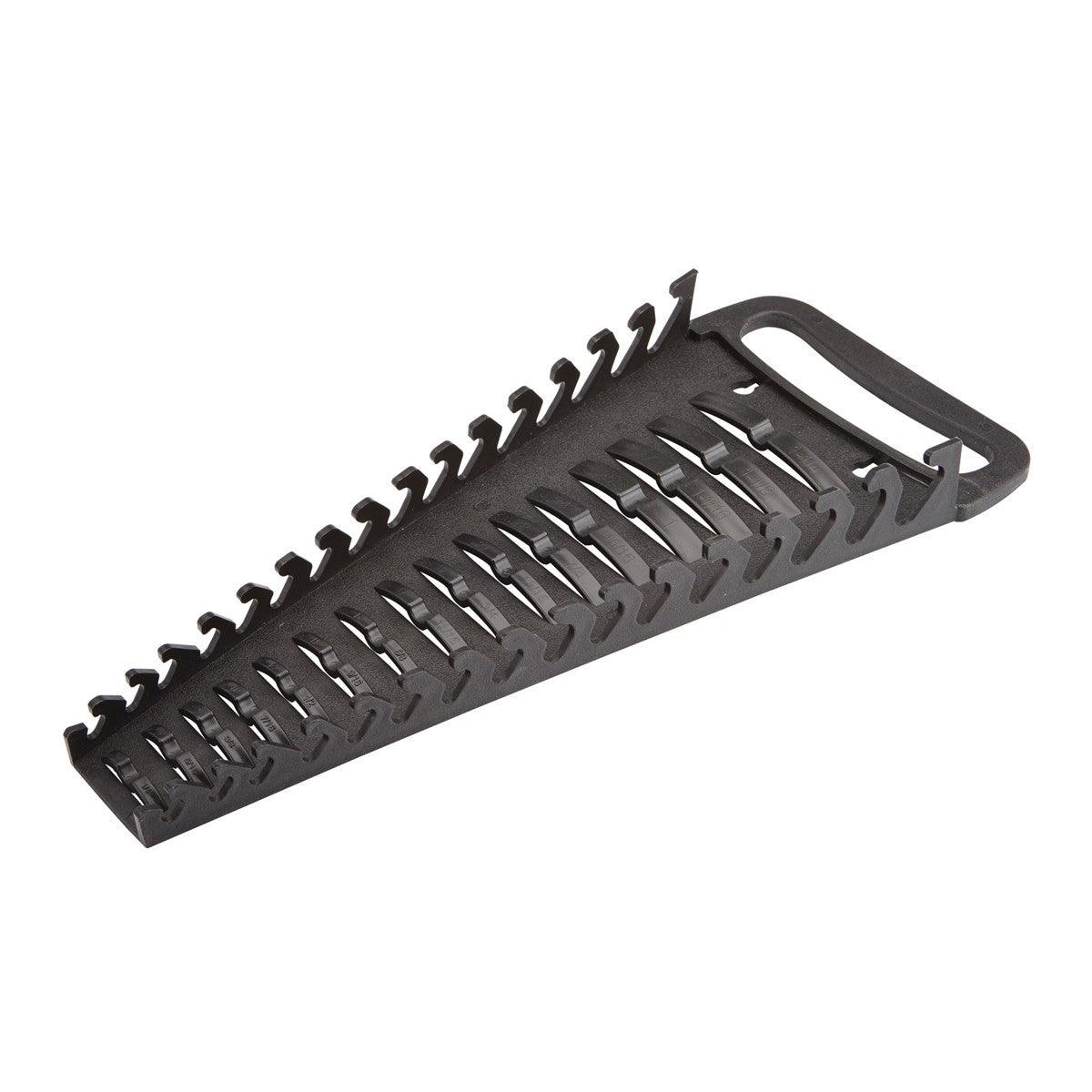 Organize your workbench and toolbox with this 16 slot wrench rack. The wrench rack features molded springs that lock your wrenches in place to keep them safe and at the ready. The wrench rack can hold open end, box or combo wrenches and is easily mounted to the wall or small enough to fit in your toolbox.