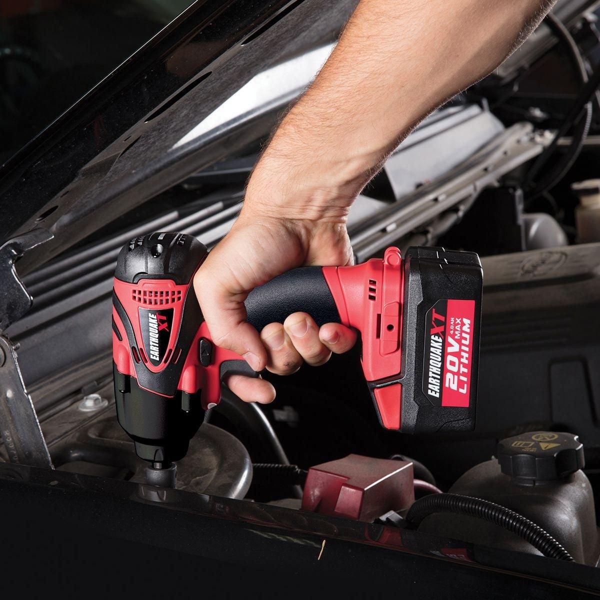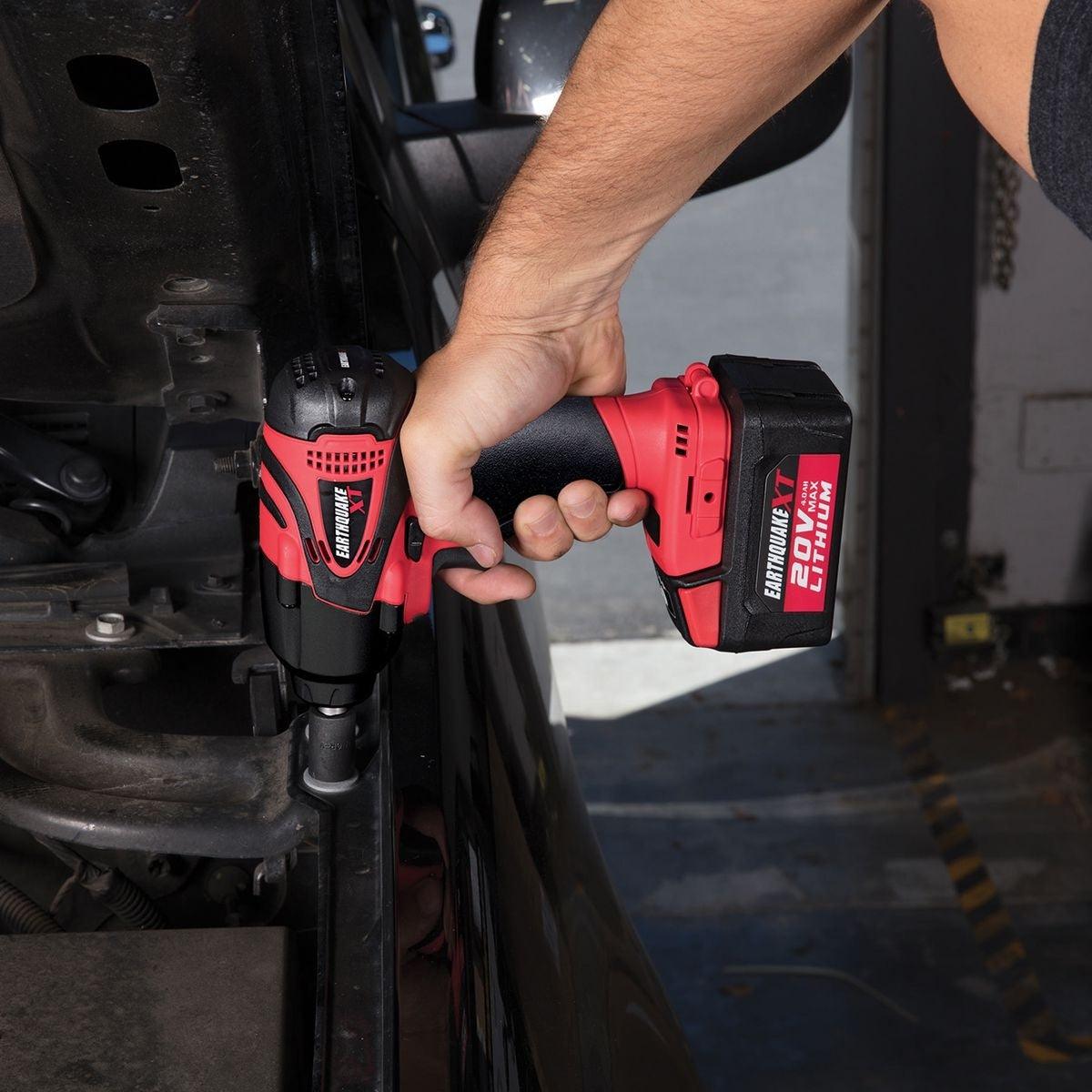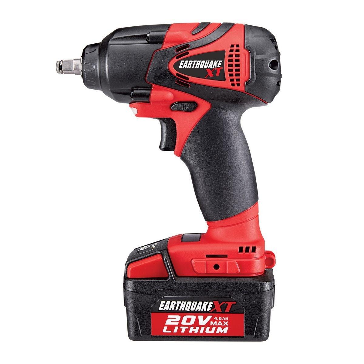 This powerful, compact cordless 3/8 in. impact wrench delivers the power of air. The EarthquakeXT Cordless Xtreme Torque Impact Wrench pounds out 370 ft. lbs. of bolt breakaway torque to power off bolts and fasteners. Combined with the EarthquakeXT Lithium battery system this impact wrench delivers high power, long run times and fast charging.