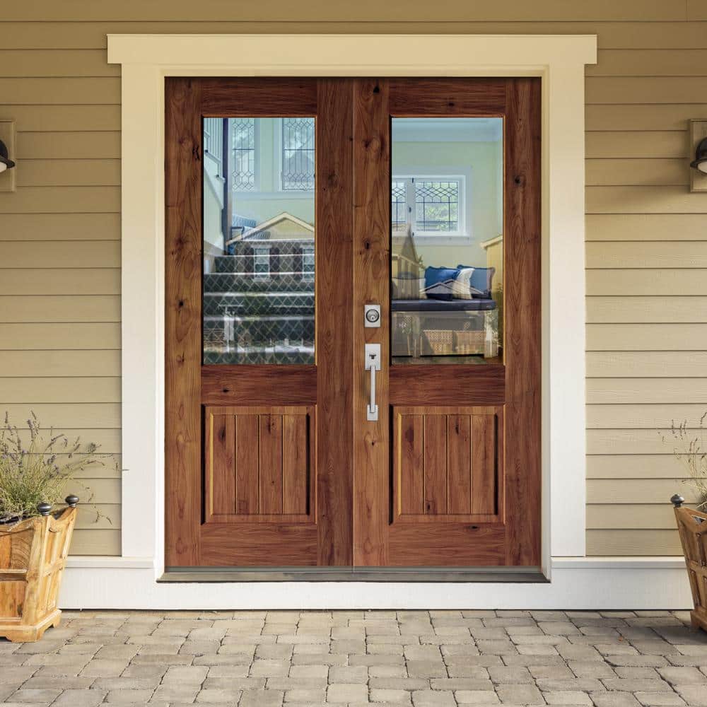 A craftsman-inspired exterior double door made from knotty alder with clear half-lite Low‑E glass. Prehung and right-active, it arrives unfinished with hand-cut V-groove panels, weatherstripping, and bronze hinges for a durable, energy‑efficient entrance.