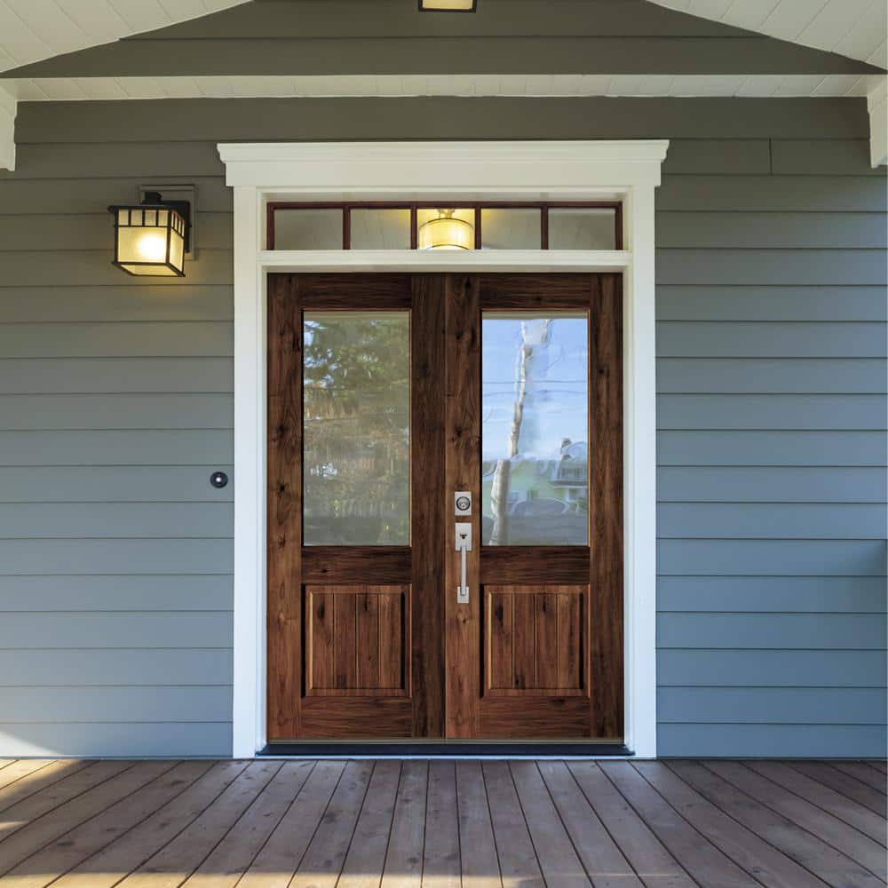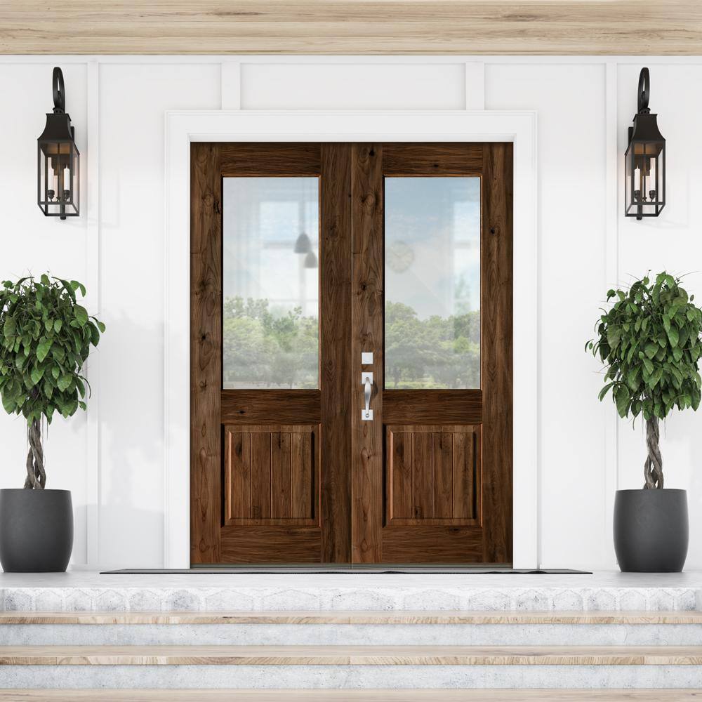 This double door invites sunlight to spill across your entry, pairing clear half-lites with richly grained knotty alder. The hand-cut V-groove panels offer artisanal texture that feels tailored yet timeless. Finish it in a deep walnut stain and style with oil-rubbed bronze hardware for an elevated Craftsman moment. It’s a statement of luxury living that greets guests with warmth and character.