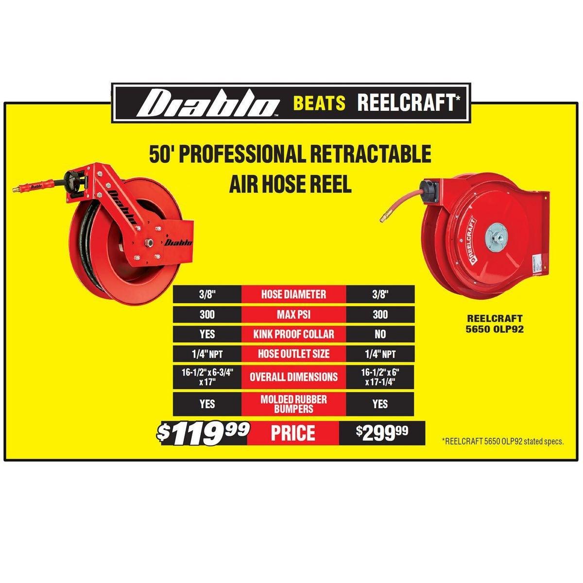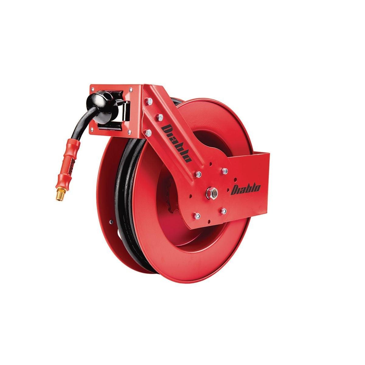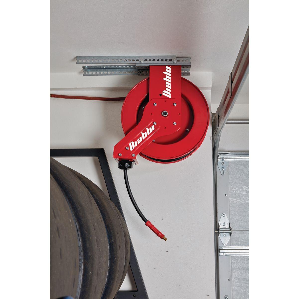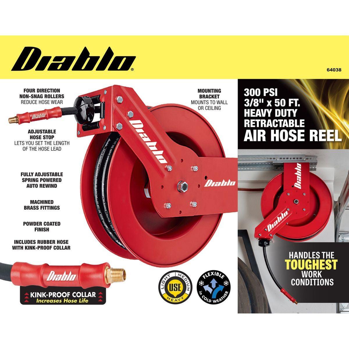 This retractable hose reel has an easy-to-set tension adjustment for effortless use. Unwind the length of hose you need and it locks in place. A simple tug rewinds the hose on the reel for trouble-free storage. Change the adjustment to suit the way you work. A 50 ft., 3/8 in. diameter Diablo™ premium rubber air hose is included.