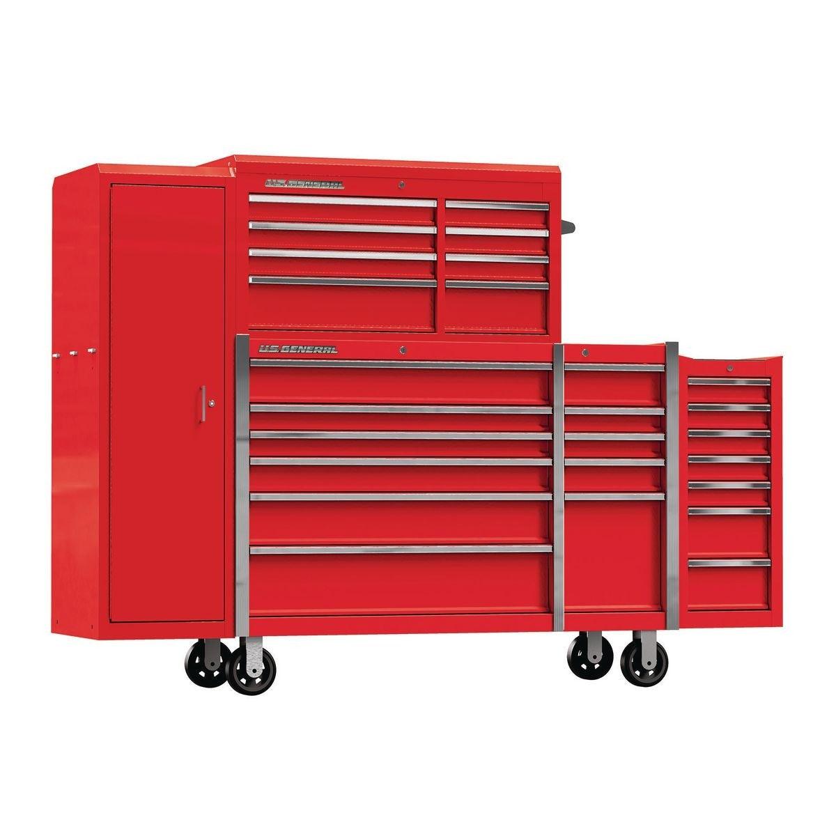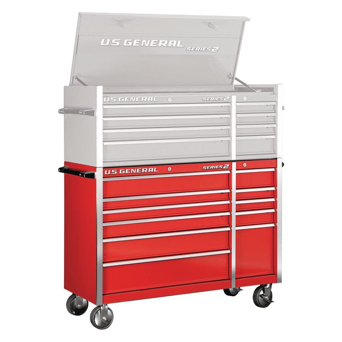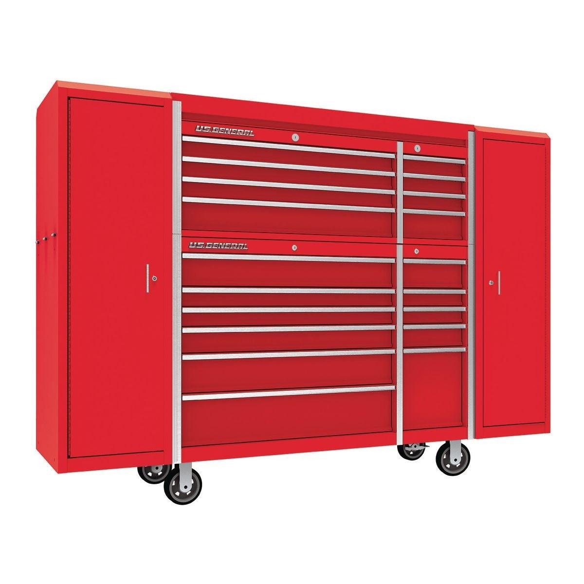 This industrial rolling tool cabinet has over 21,500 cu in. of tool storage space. Featuring a heavy duty powder coat finish, all steel construction and two separate drawer locks with one spare key each, this roller cabinet is designed for professional service. Non-slip pre-cut drawer liners keep your tools in place while a secure latch system keeps doors shut even when maneuvering the tool cabinet on its rugged 6 in. casters.