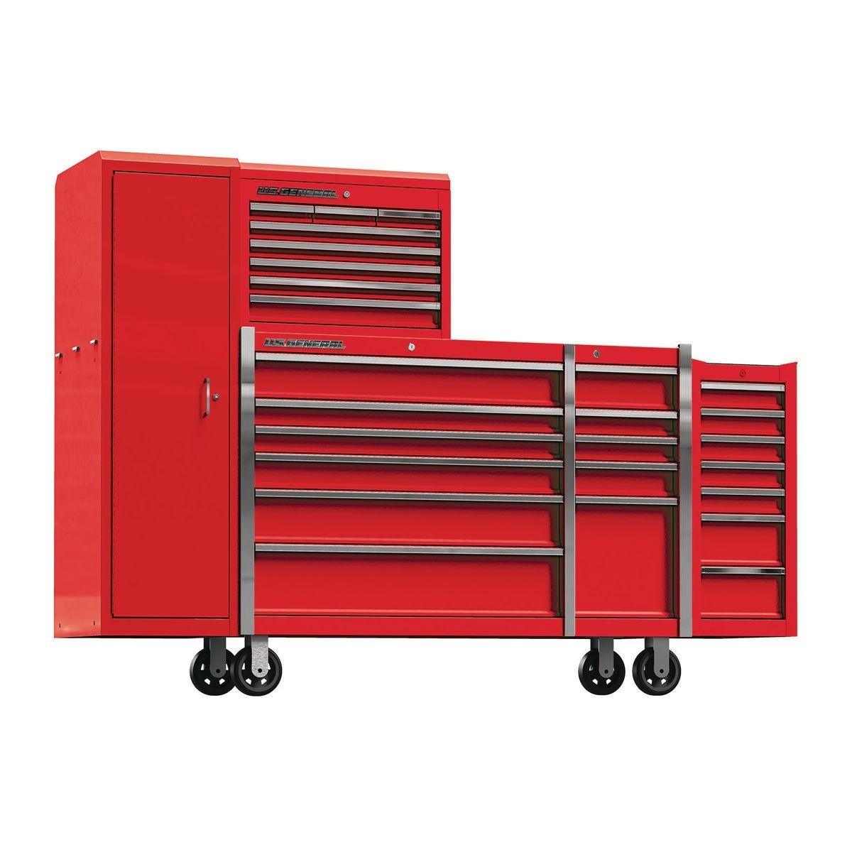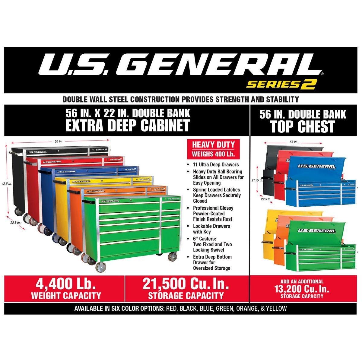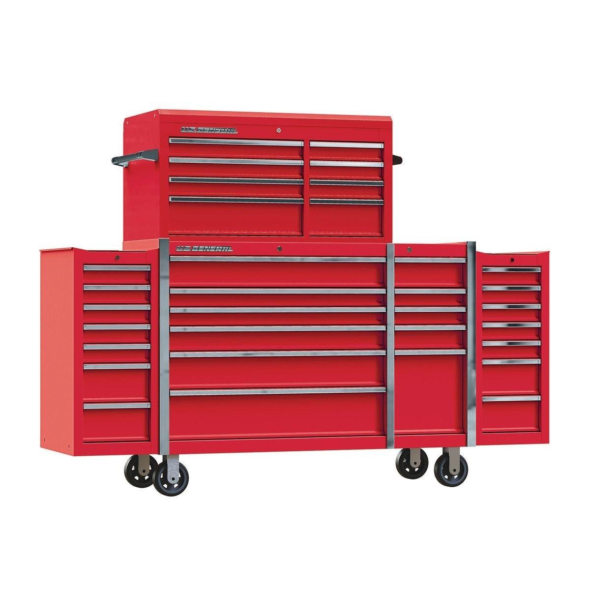 This industrial rolling tool cabinet has over 21,500 cu in. of tool storage space. Featuring a heavy duty powder coat finish, all steel construction and two separate drawer locks with one spare key each, this roller cabinet is designed for professional service. Non-slip pre-cut drawer liners keep your tools in place while a secure latch system keeps doors shut even when maneuvering the tool cabinet on its rugged 6 in. casters.