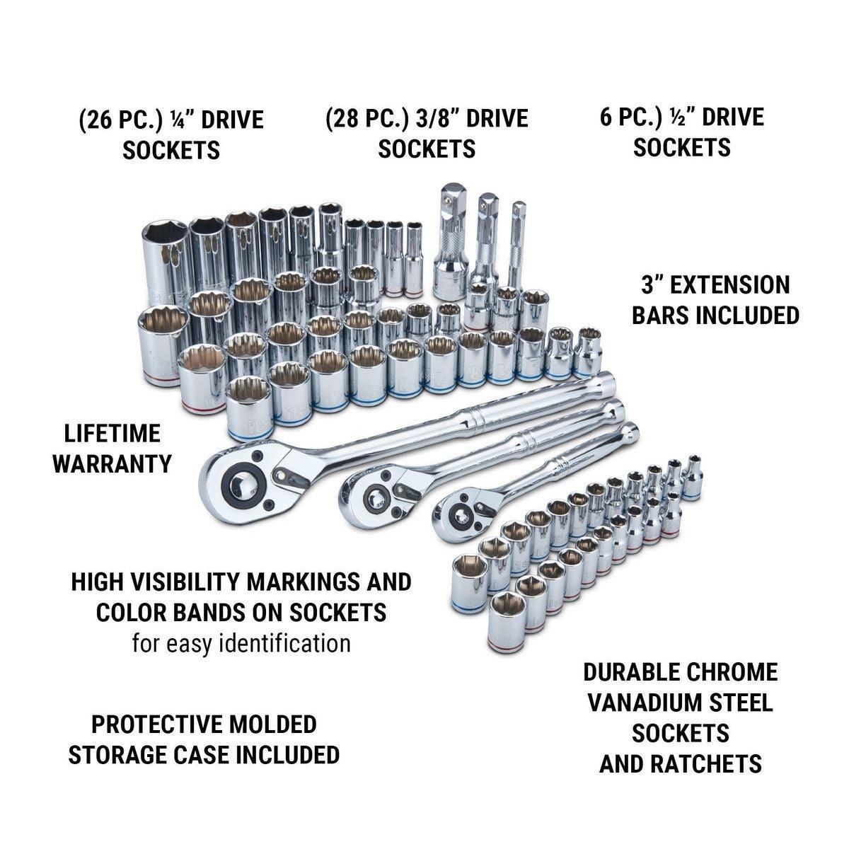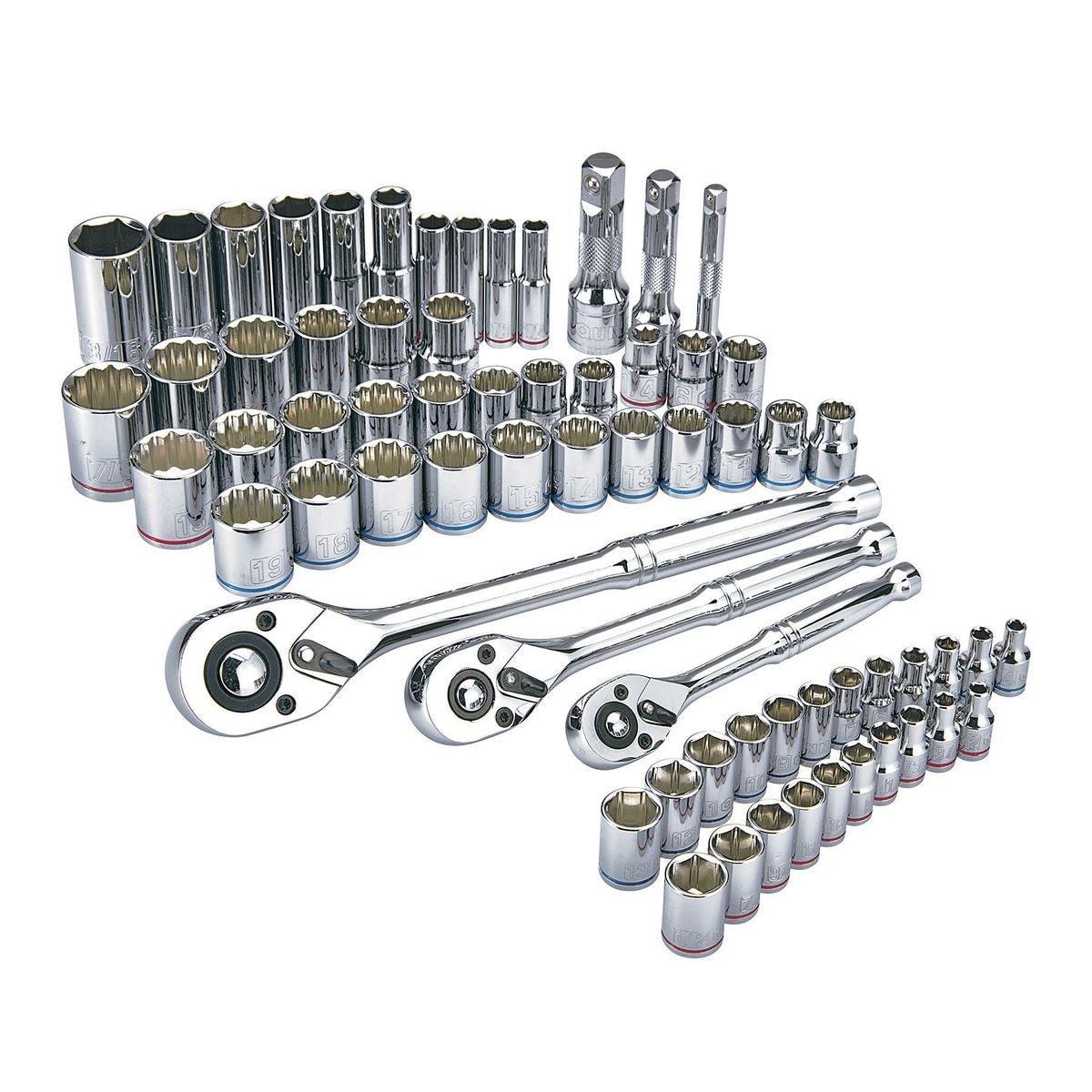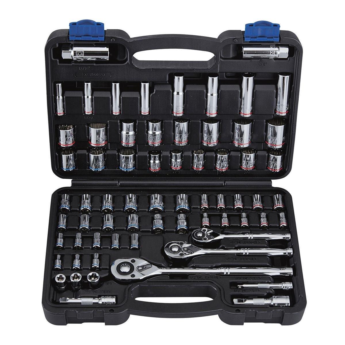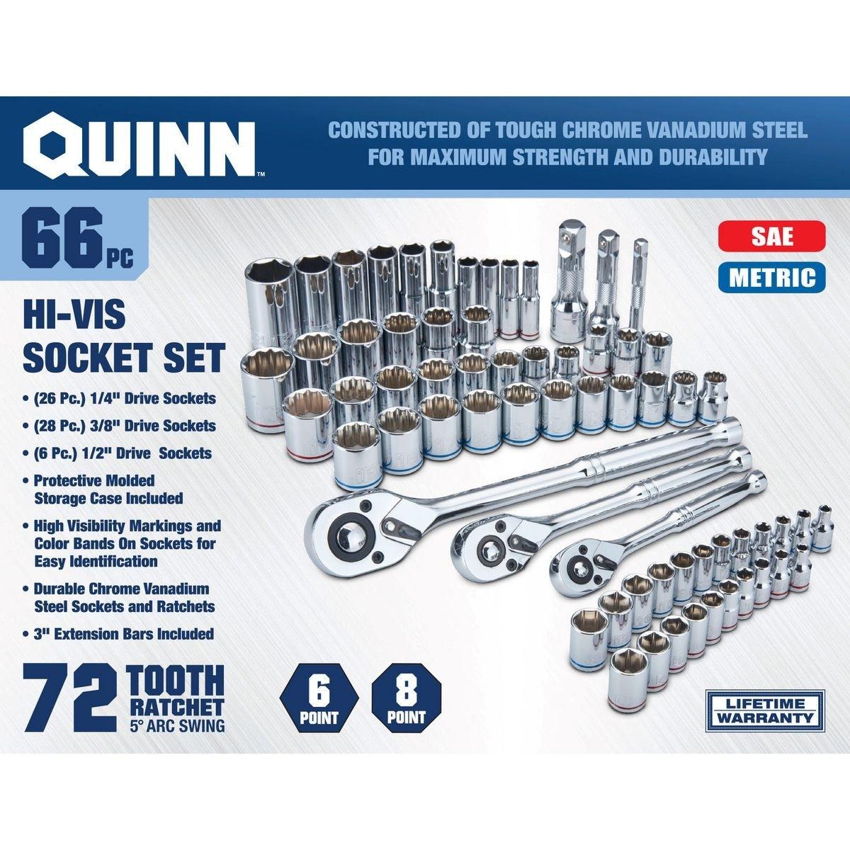 This 66 Pc. Socket set by Quinn® offers a range of the most widely used socket sizes. Constructed from rugged chrome vanadium steel providing greater resistance and protection from scratches, rust and corroding. Sturdy and durable enough for regular use, this Metric and SAE socket set also features high visibility markings for quick and easy bit selection. .