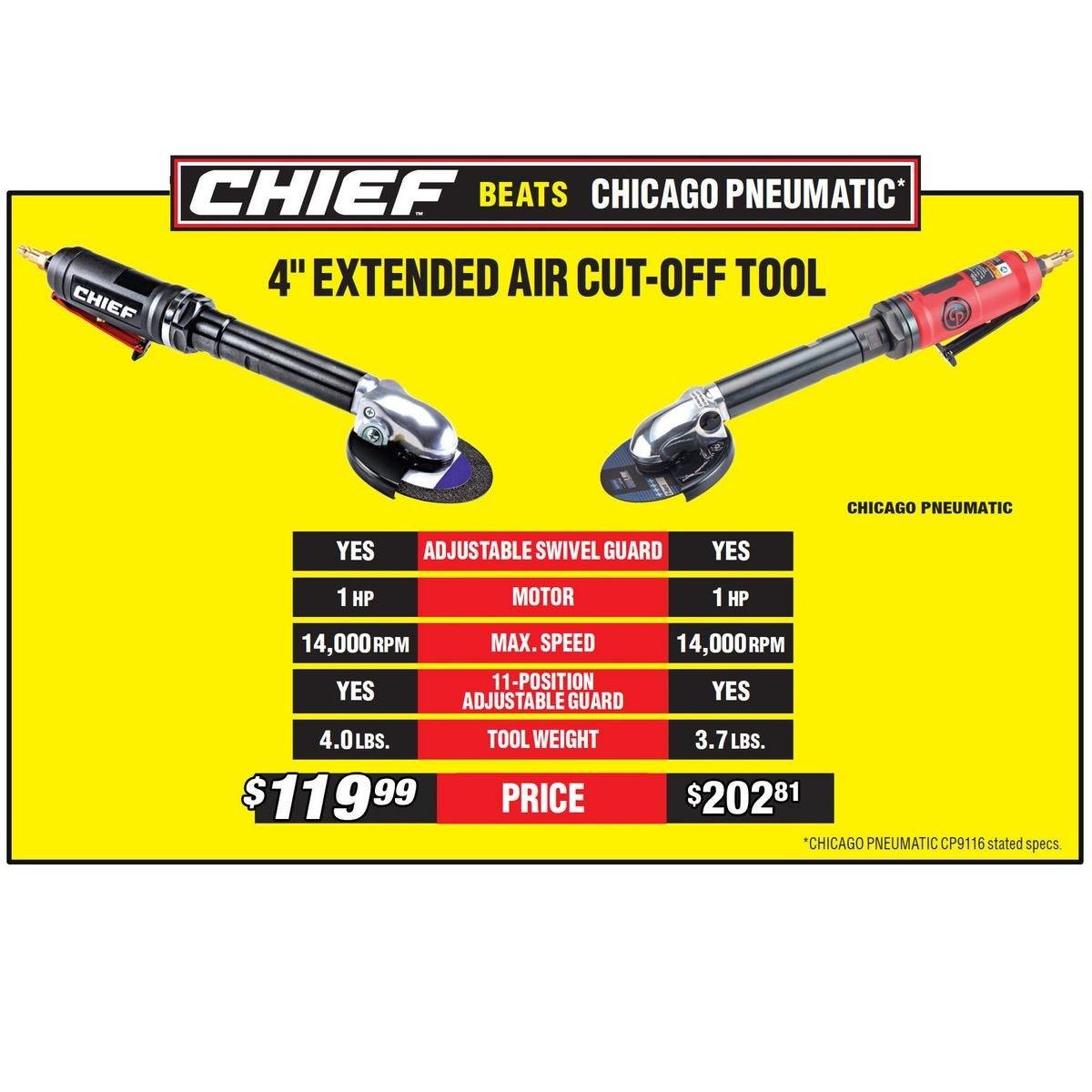 The Chief™ 4 in. Professional High Speed Extended Reach Air Cut-Off Tool has an extra long shaft to reach muffler hangers, broken studs in engine bays and other obstructed components. With a lightweight composite body the cut-off tool is rugged and easy to handle for precise control. Features include rear exhaust and a steel wheel guard for added safety.