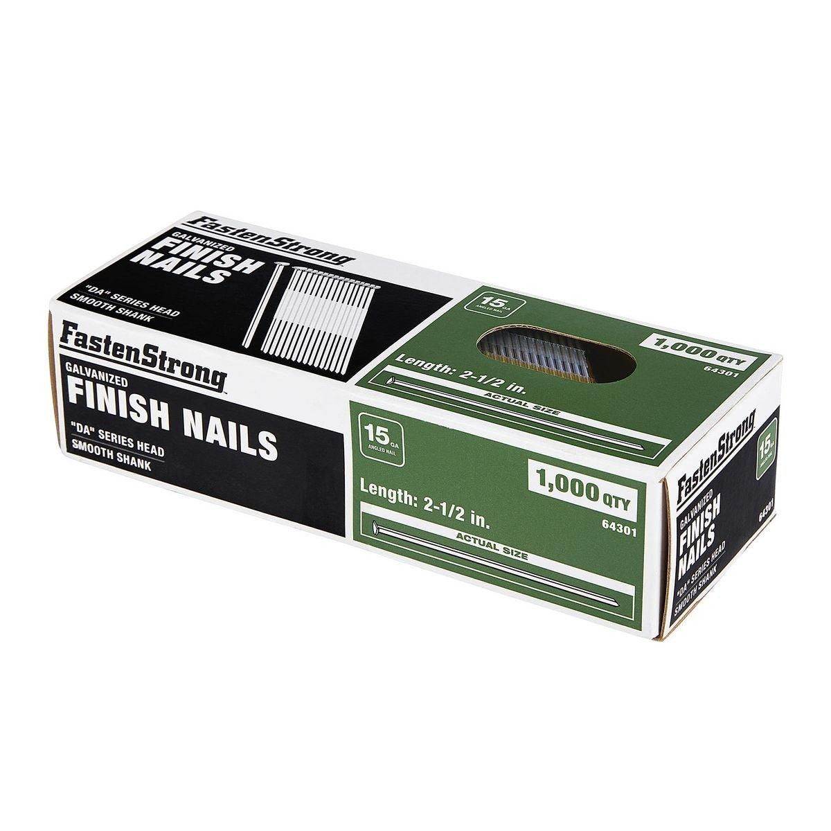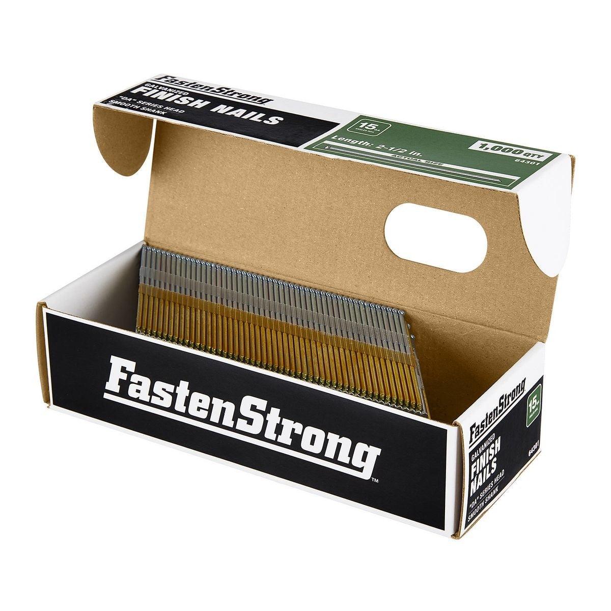 FastenStrong™ galvanized finish nails are angled for use in standard 15 GA nailers. The nails feature adhesive collation and a smooth shank.