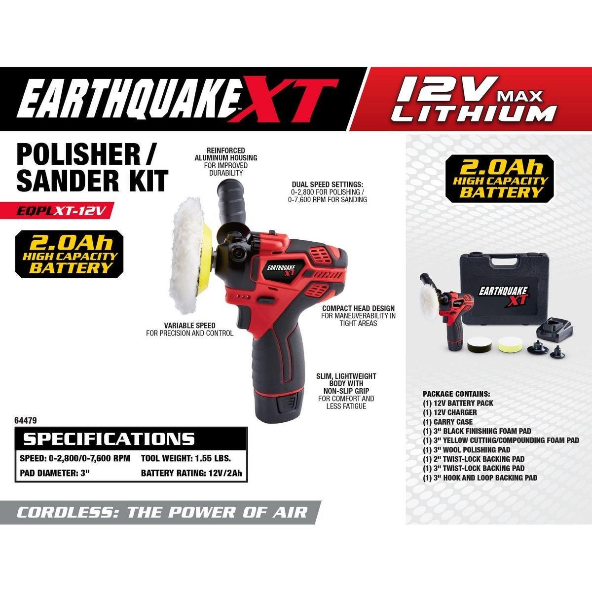 The Earthquake® XT 12v Max Lithium Cordless Compact Polisher/Sander performs the work of two tools in one. Compact and lightweight, this powerful 12v polisher delivers 0-2800 RPM for polishing and 0-7600 RPM for sanding. Featuring a compact head and slim lightweight body, this tool is designed for maneuverability in tight areas. With dual speed settings and a variable speed trigger, the 12v Earthquake® XT Polisher/Sander delivers unparalleled precision and control
