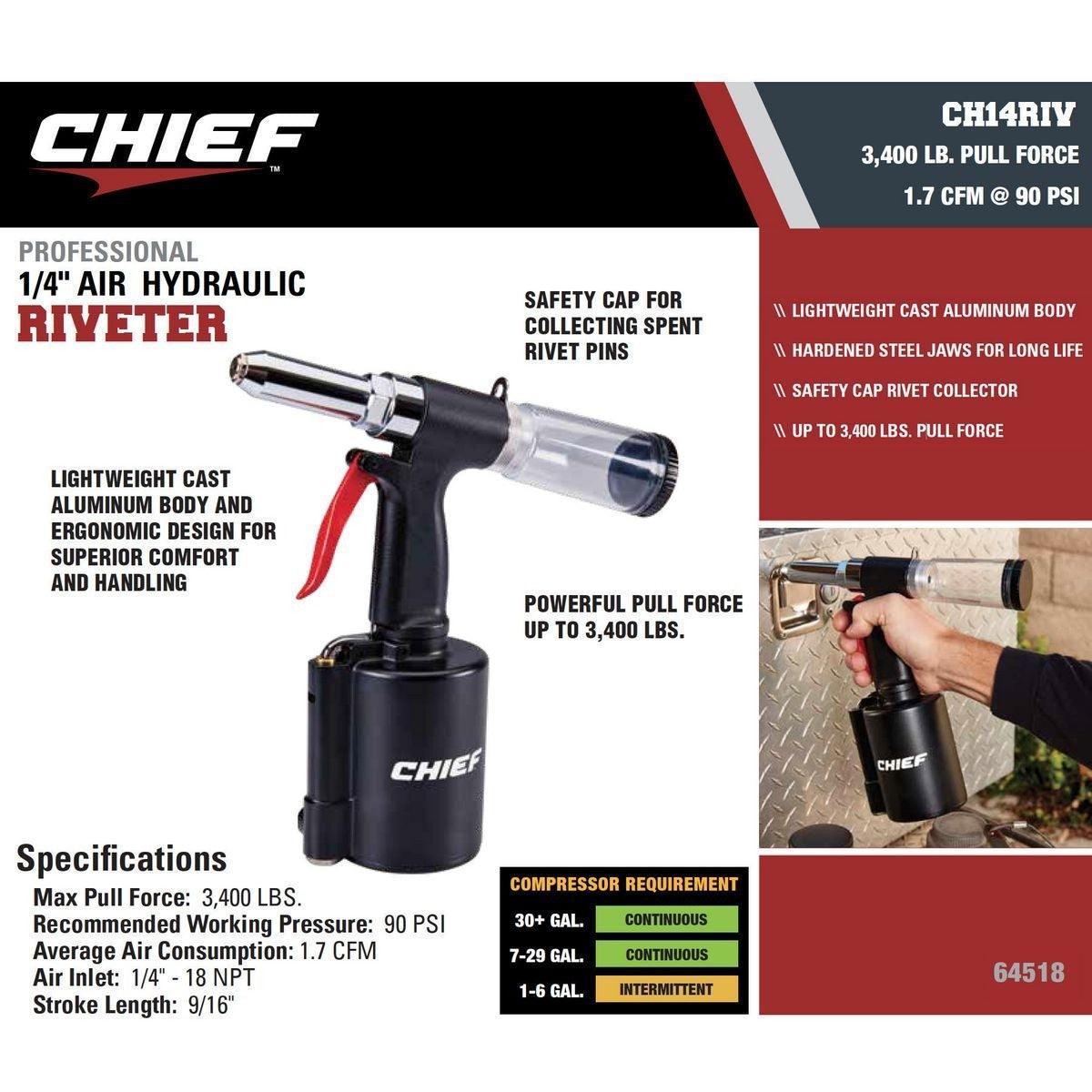 This Professional Air Hydraulic Riveter generates up to 3,400 lbs. of pull force for quick, precise riveting. The lightweight body is easy to handle and tough enough to take a beating. Six nosepieces let you work with a wide range of rivet sizes. Features include a safety cap to collect spent rivet pins and an air relief valve to prevent overloading.