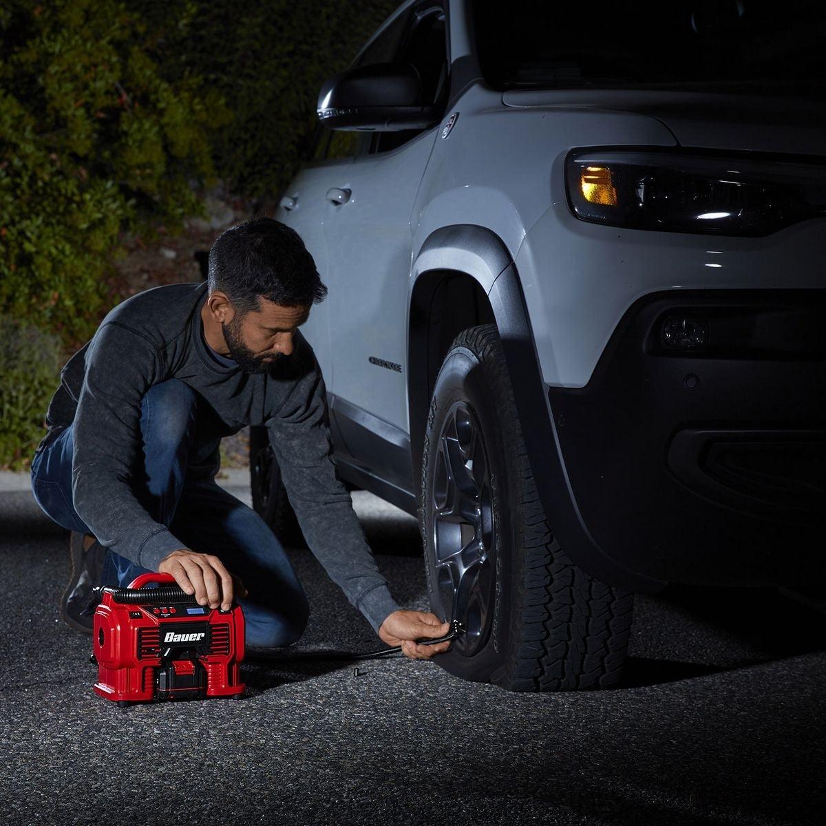 The Bauer™ 20v cordless and 12v corded inflator/deflator delivers heavy duty performance in a compact and portable design. Featuring high output pressure of 160 PSI this inflator can air most tires in two minutes. High volume air output makes it easy to quickly inflate large inflatables such as air mattresses. The digital pressure readout with automatic shut off prevents over-inflation. This cordless inflator/deflator also comes equipped with a storage compartment for holding accessories. Buy with confidence with an included no-questions-asked risk-free trial, extendable for up to 2 years.