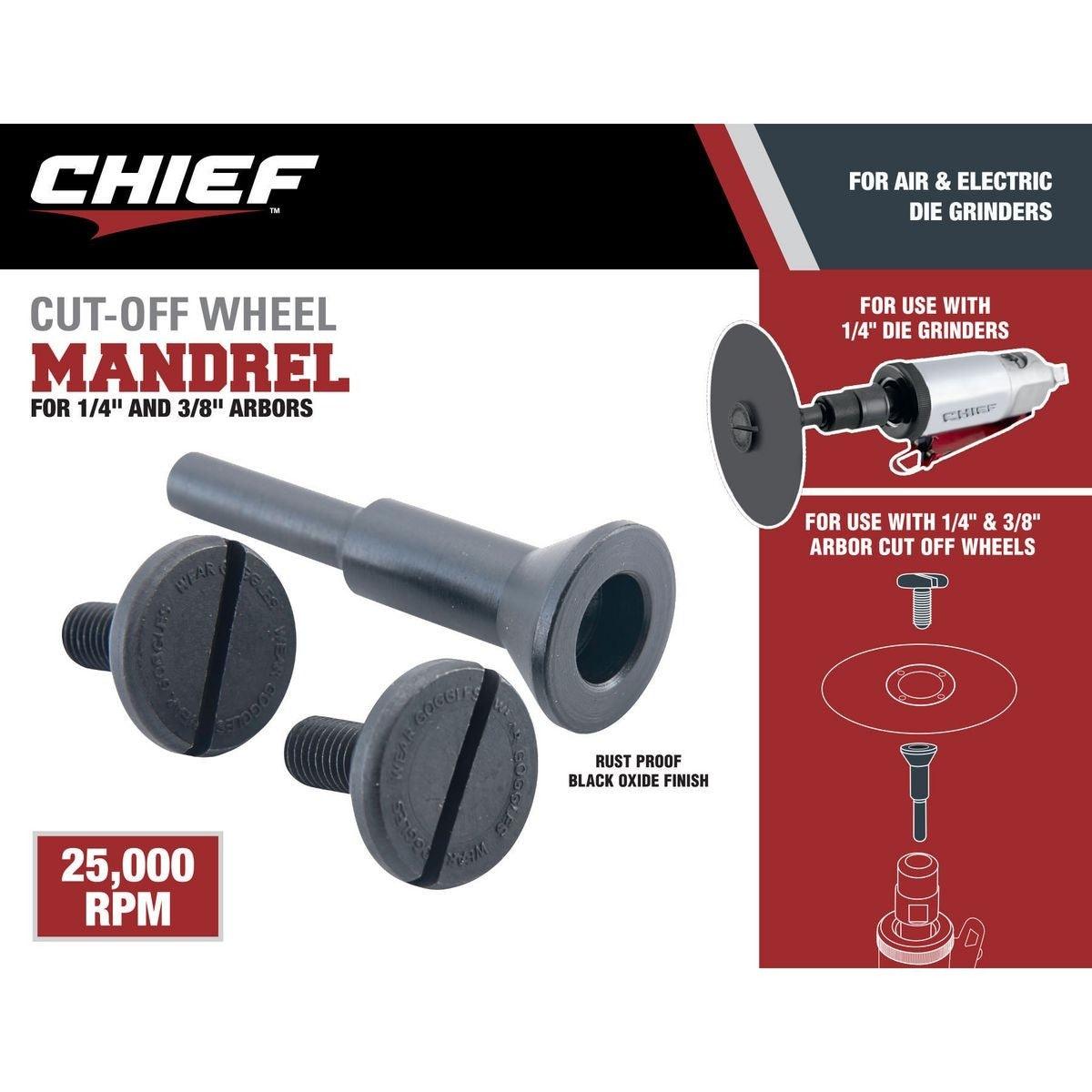This cut-off wheel arbor is for use with your die grinder or power drill. The arbor fits cut-off wheels with 1/4 in, 3/8 in. holes and is zinc plated to resist rust.