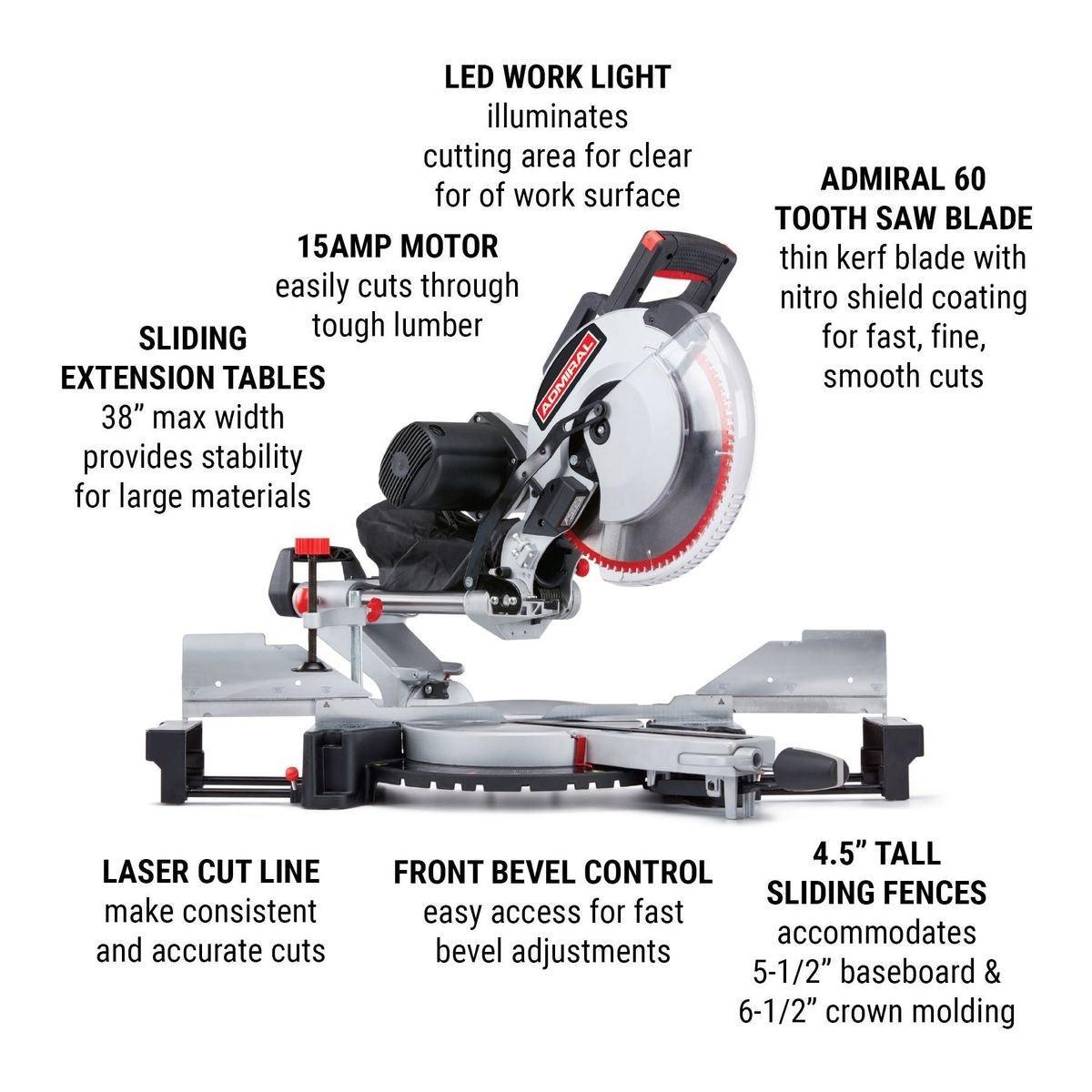 Comes with an Admiral 60 tooth thin-kerf saw blade with NitroShield® coating for fast, fine, smooth cuts