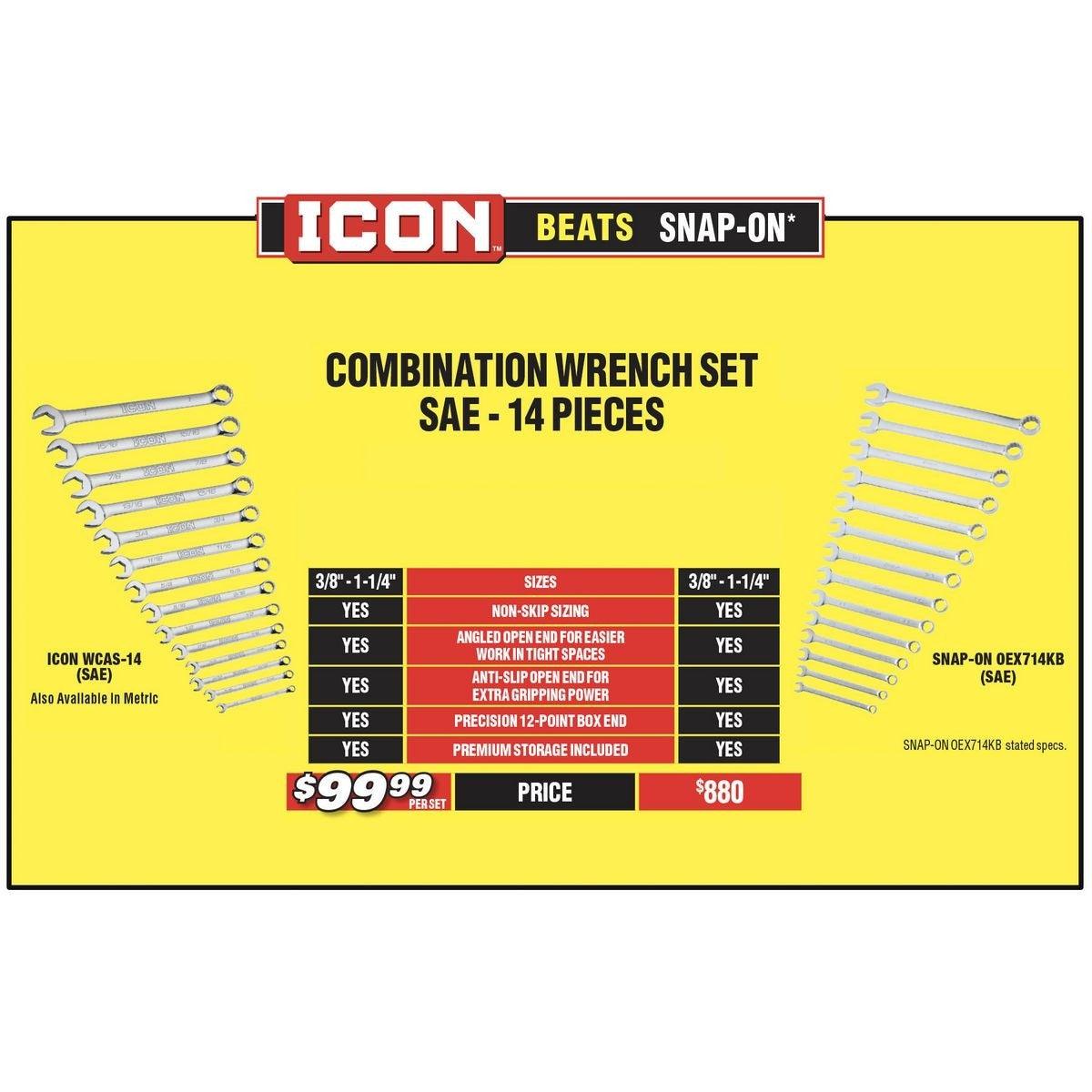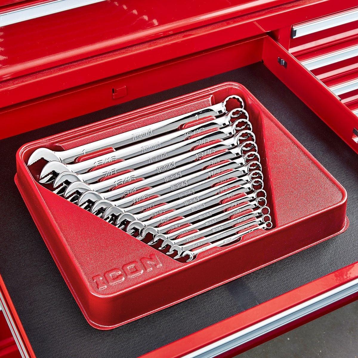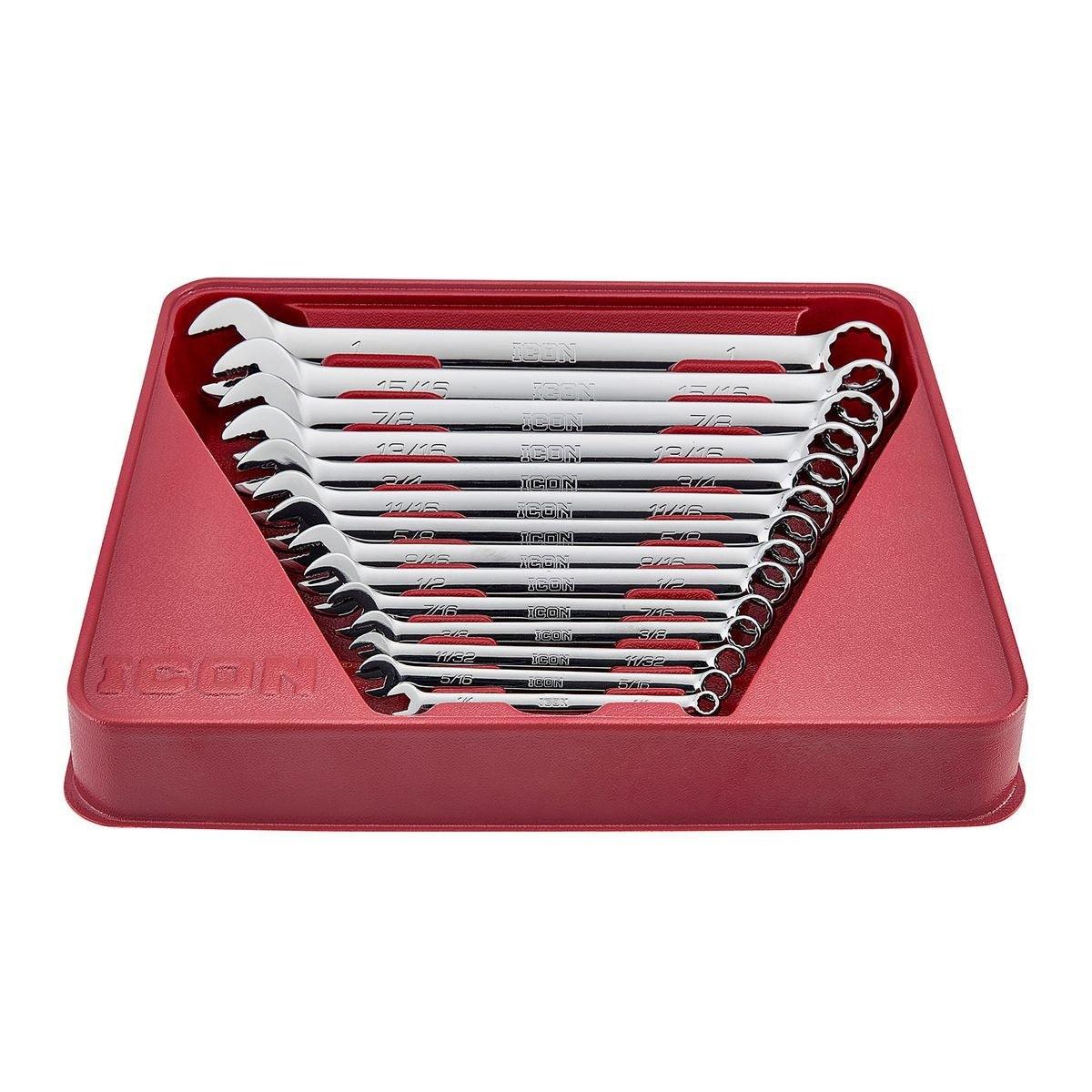 The Icon™ Professional Combination Wrench Set is precision-machined for a perfect non-slip grip, and features a 12-point box end for easy fastener engagement without slippage and prevents fastener round-off, resulting in more efficient work. We use a premium chrome vanadium steel, with a tough and durable polished chrome finish that offers superior rust and corrosion resistance and prevents grease build-up. The angled open end allows easier work in tight spaces, while the 15° offset for knuckle clearance makes it easier to reach around obstructions. Designed with comfort and efficiency in mind, the Icon™ Professional Combination Wrench Set offers a balanced handle design for a comfortable secure grip, and is backed by a hassle-free manufacturer's lifetime warranty.