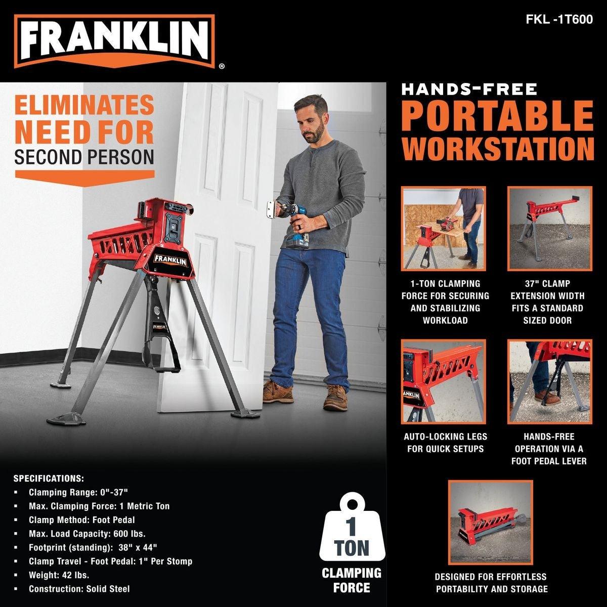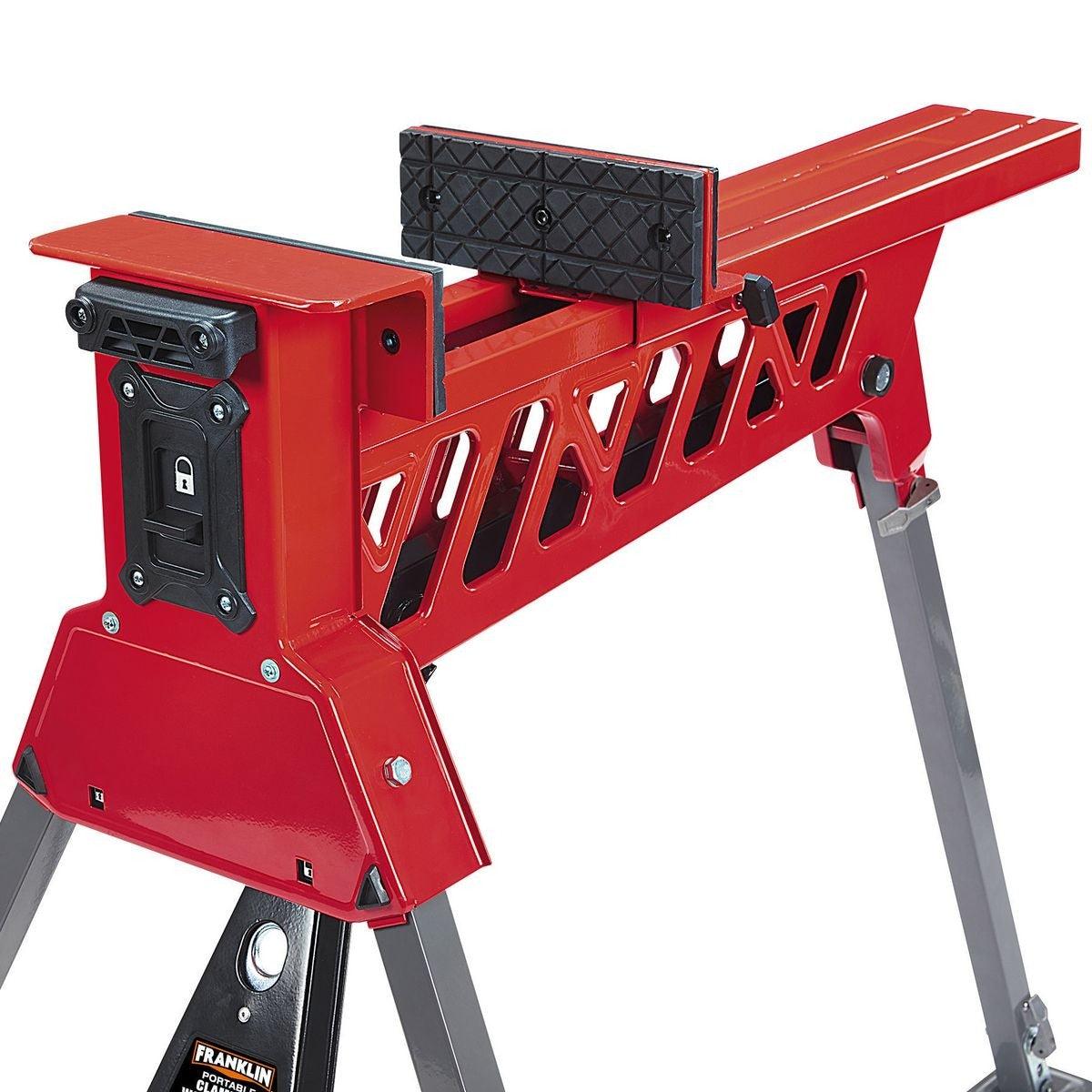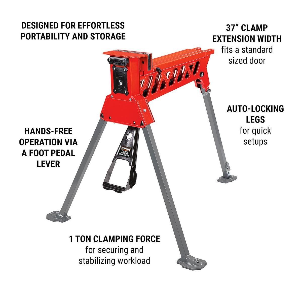 The Franklin™ portable clamping workstation is designed for hands-free operation to secure and stabilize workloads. The extra-wide clamping extension can handle a standard size door. Rugged steel construction supports workloads up to 600 lbs. while 1 metric ton of clamping force keeps the workpiece locked in place. Auto-locking legs set-up easily and break down in seconds for convenient storage.