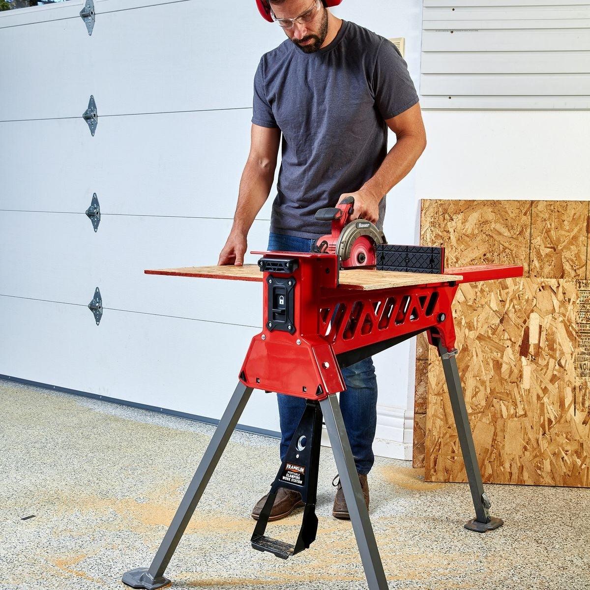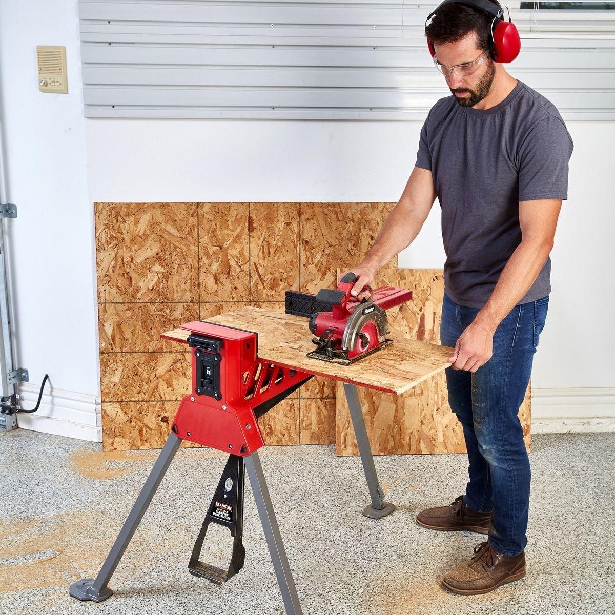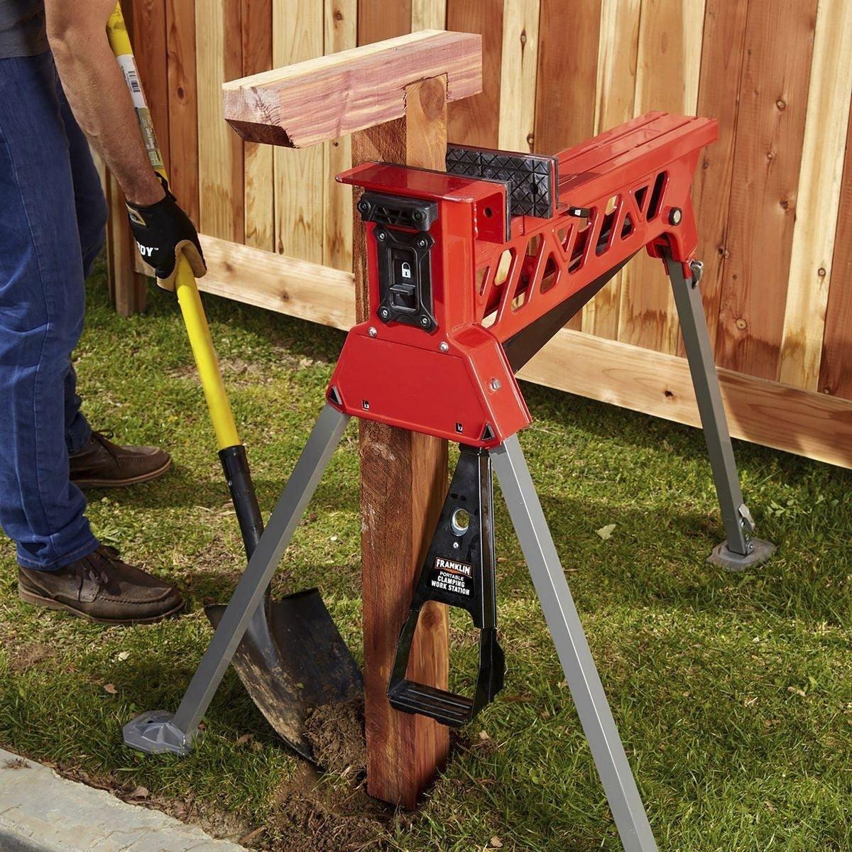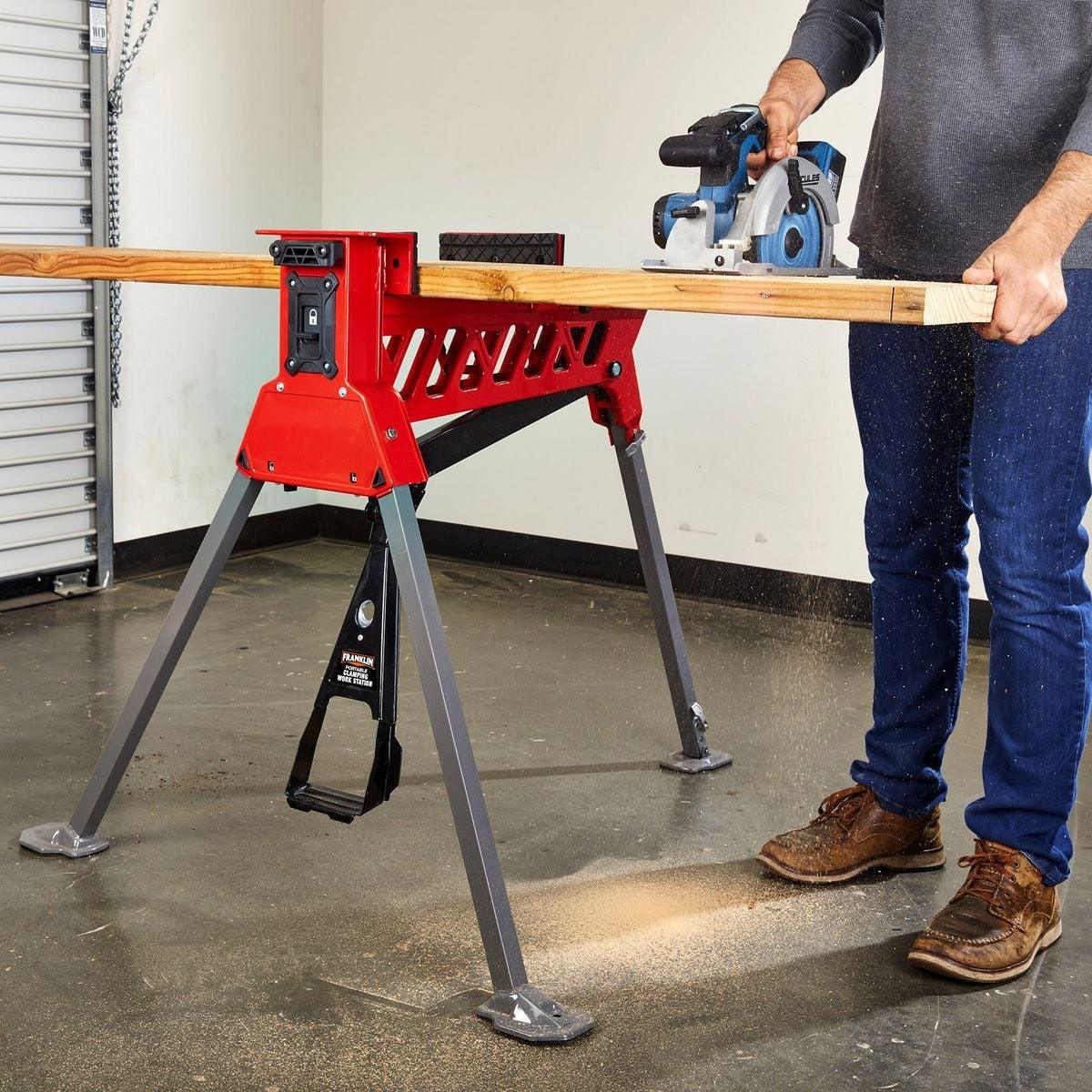The Franklin™ portable clamping workstation is designed for hands-free operation to secure and stabilize workloads. The extra-wide clamping extension can handle a standard size door. Rugged steel construction supports workloads up to 600 lbs. while 1 metric ton of clamping force keeps the workpiece locked in place. Auto-locking legs set-up easily and break down in seconds for convenient storage.