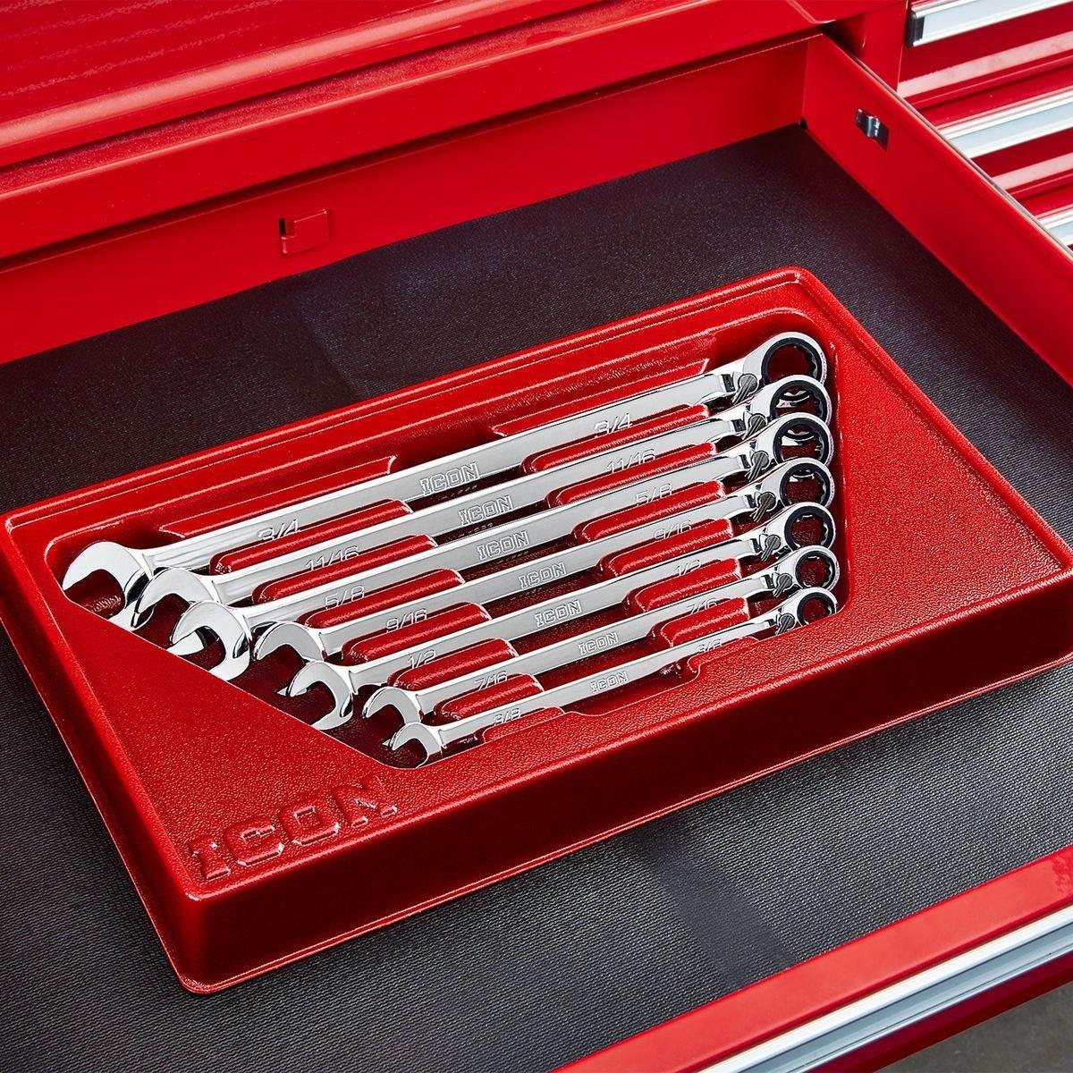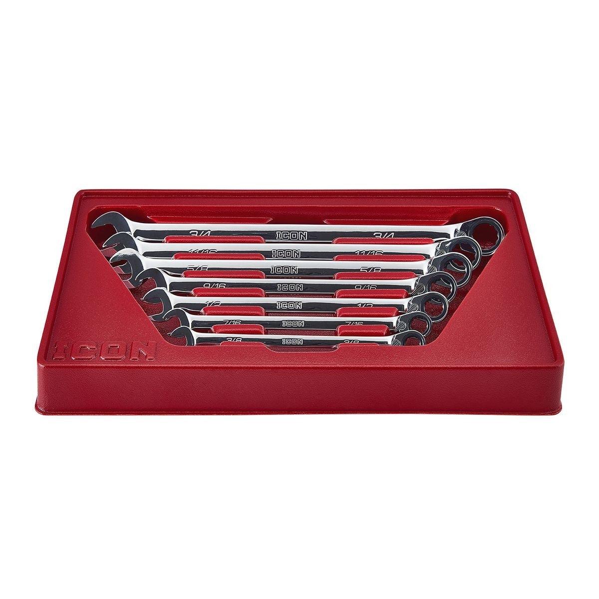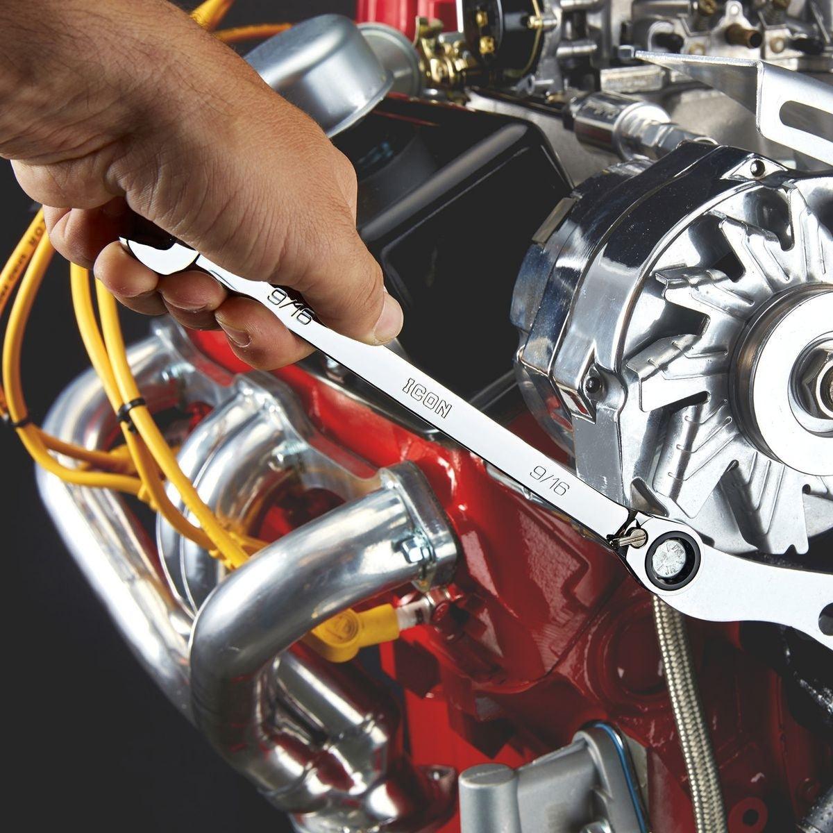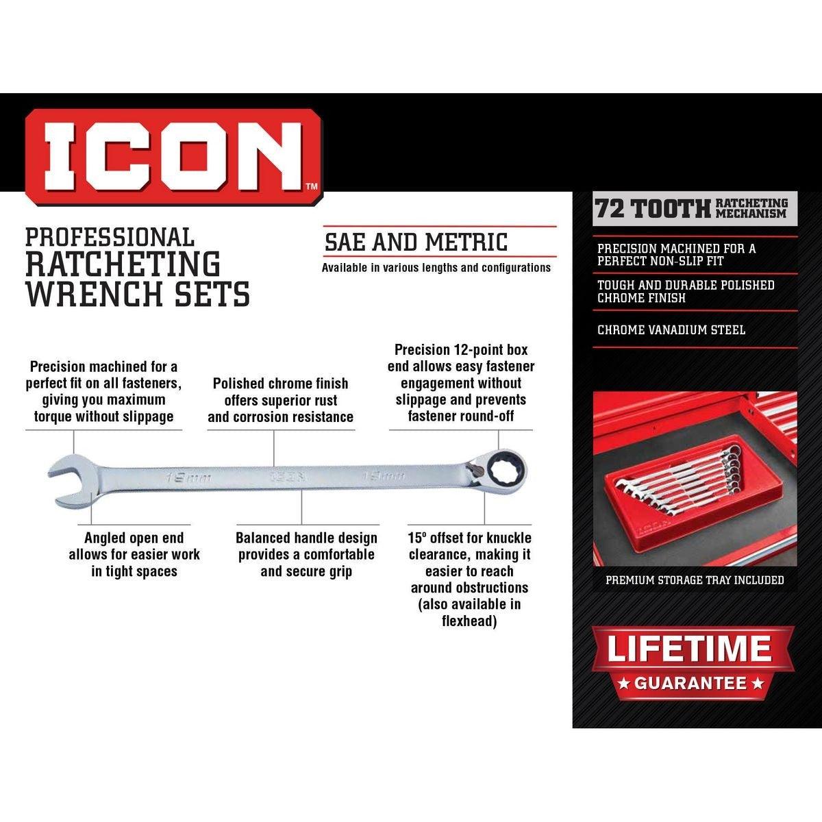 The Icon™ Professional Ratcheting Combination Wrench Set is precision-machined for a perfect non-slip grip, and features a reversible 72 tooth ratcheting box end for easy fastener engagement without slippage and prevents fastener round-off, resulting in more efficient work. We use a premium chrome vanadium steel, with a tough and durable polished chrome finish that offers superior rust and corrosion resistance and prevents grease build-up. The angled open end allows easier work in tight spaces, while the 15 ° offset for knuckle clearance makes it easier to reach around obstructions. Designed with comfort and efficiency in mind, the Icon™ Professional Ratcheting Combination Wrench Set offers a balanced handle design for a comfortable secure grip, and is backed by a hassle-free manufacturer's lifetime warranty.
