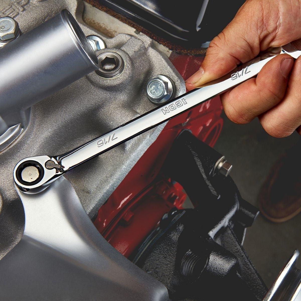 The Icon™ Professional Ratcheting Combo Wrench Set is precision-machined for a perfect non-slip grip, and features a reversible 72 tooth ratcheting box end for easy fastener engagement without slippage and prevents fastener round-off, resulting in more efficient work. We use a premium chrome vanadium steel, with a tough and durable polished chrome finish that offers superior rust and corrosion resistance and prevents grease build-up. The angled open end allows easier work in tight spaces, while the 15° offset for knuckle clearance makes it easier to reach around obstructions. Designed with comfort and efficiency in mind, the Icon™ Professional Ratcheting Combo Wrench Set offers a balanced handle design for a comfortable secure grip, and is backed by a hassle-free manufacturer's lifetime warranty.