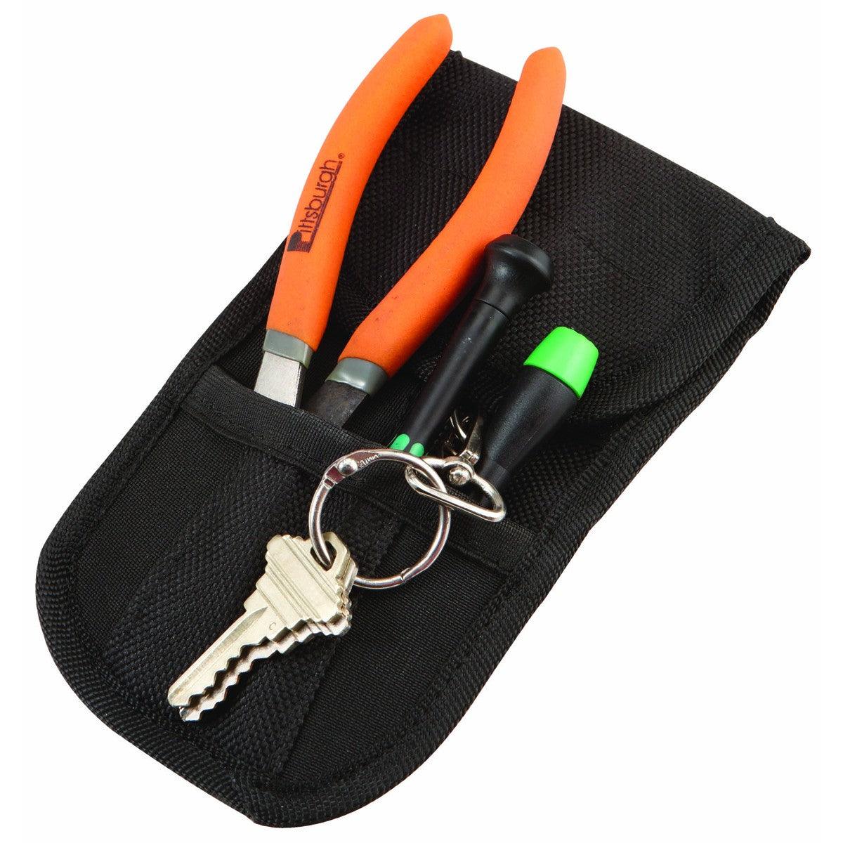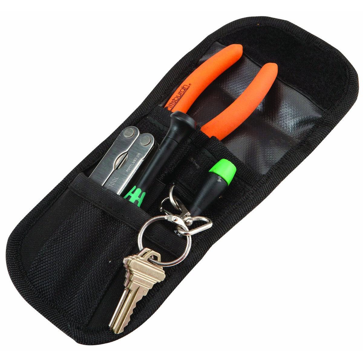 Holds folding and non-folding tools, small flashlights, keys, pens, screwdrivers, scissors