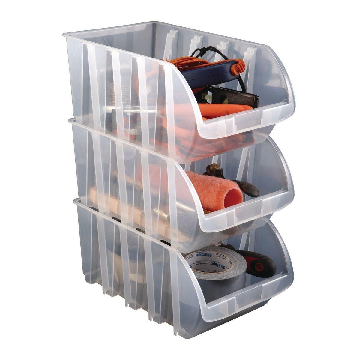 This large stacking bin is great for storing office and kitchen supplies or organizing hardware and tools in the garage! Constructed of heavy duty plastic for durability, the large plastic bin neatly stacks in cabinets and desktops and can also be wall mounted. The plastic bin is clear to easily identify contents.
