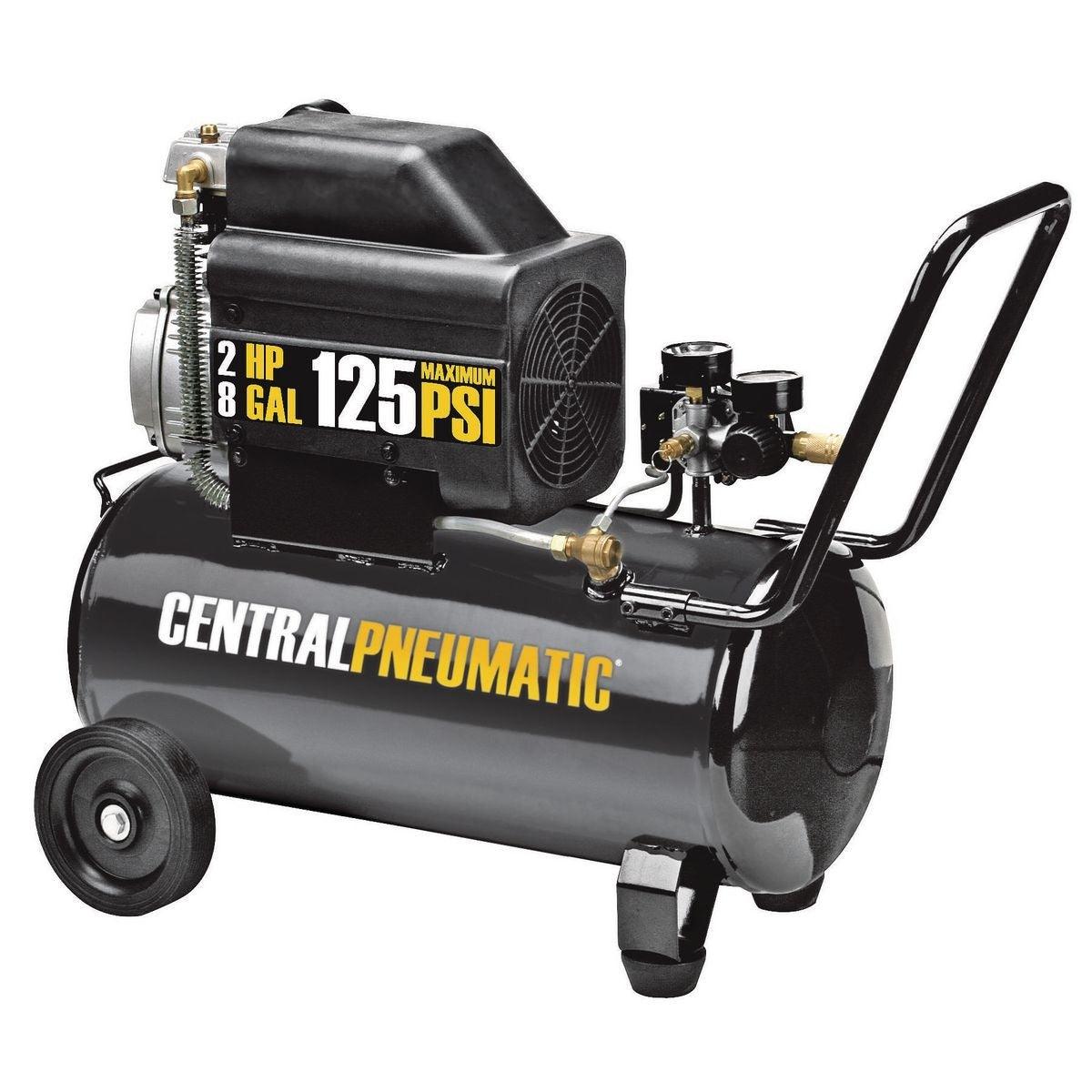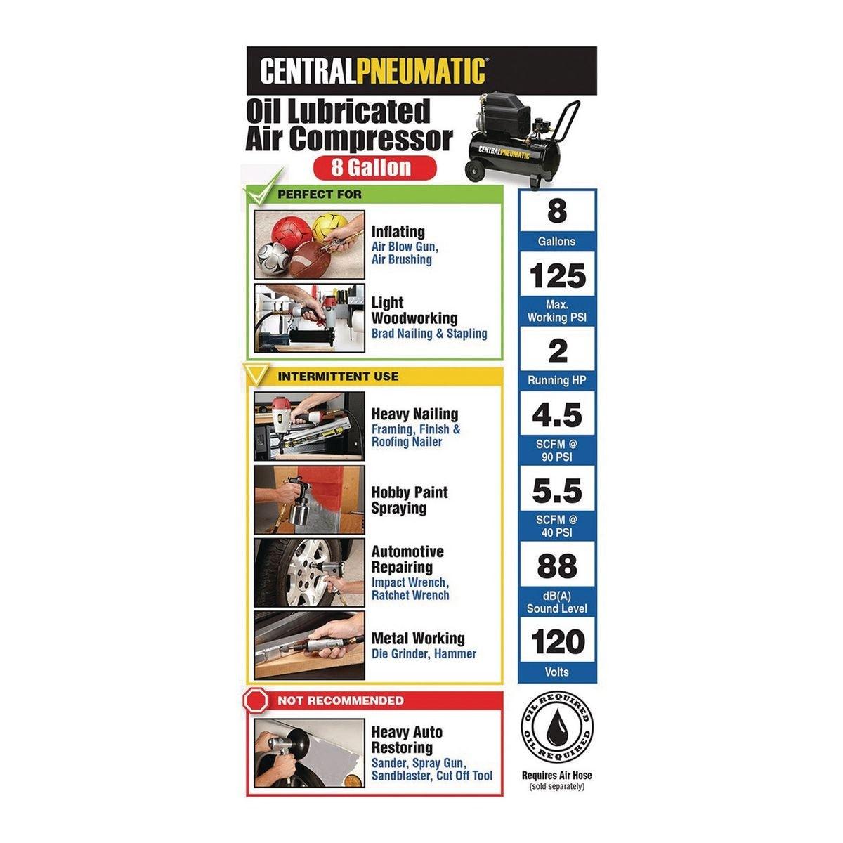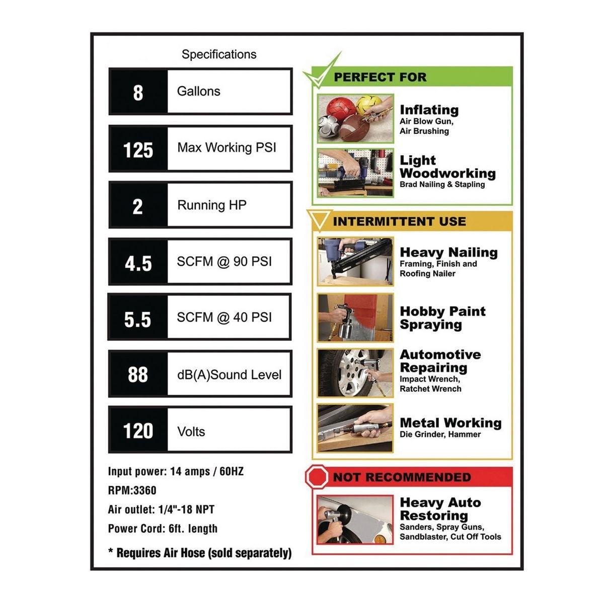 The 8 gallon tank on this air compressor provides the power you need to operate your pneumatic tools and equipment. This air compressor’s direct drive induction motor for more available power. Thermal load protection keeps the motor safe. Features include a convenient handle, smooth-rolling wheels and a fully shrouded pump and motor for protection.