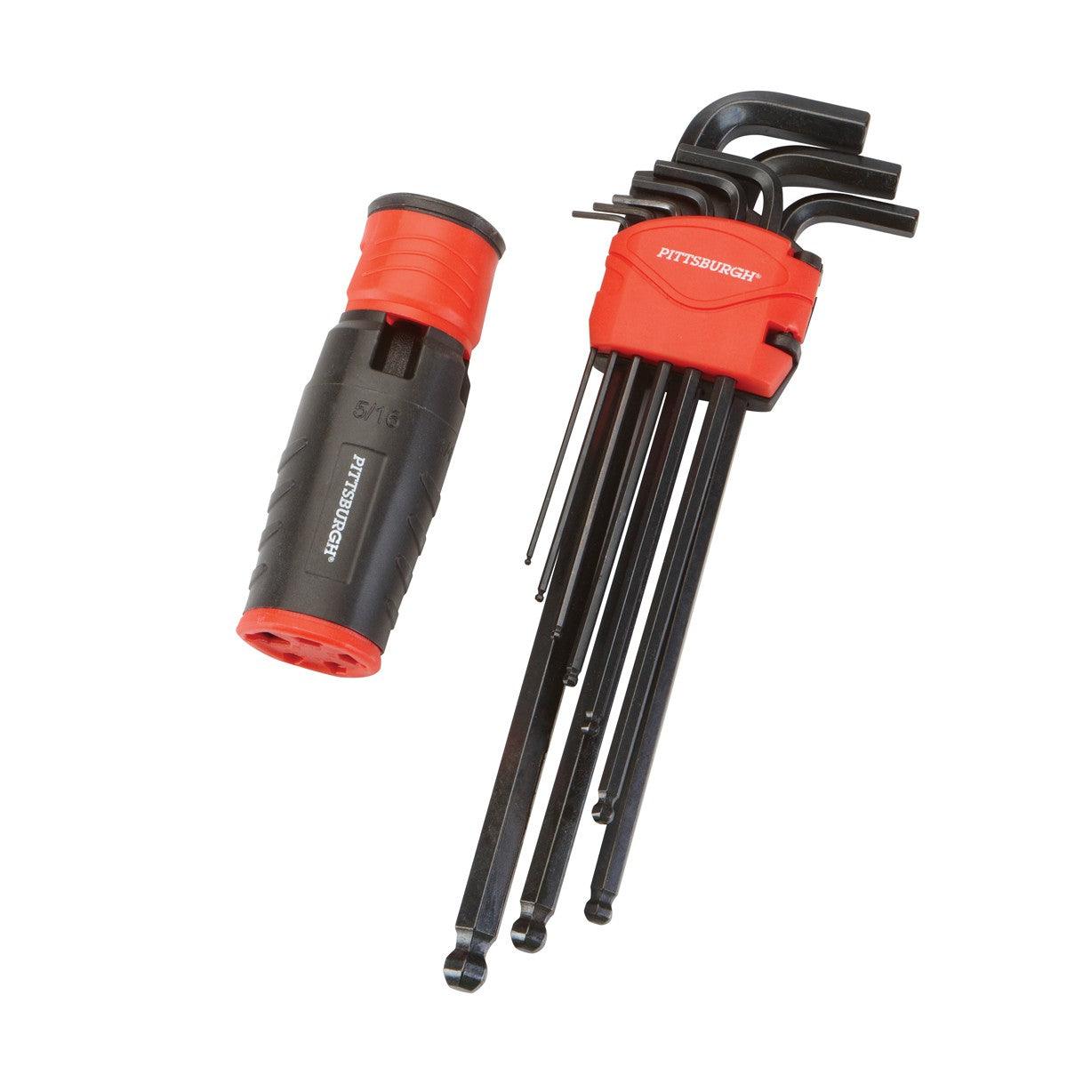 This hex key system delivers the same high torque as standard wrenches yet also lets you get hard-to-reach fasteners. The handle system also works like a T-wrench set for even more versatility. The hex key wrench system comes with a convenient key caddy for easy transport and storage.