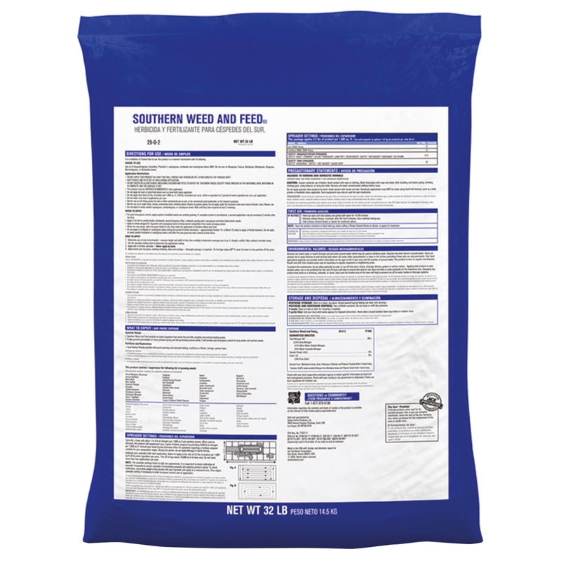 Granular weed-and-feed for southern lawns that kills broadleaf weeds while feeding grass. Formulated with timed-release nitrogen for extended feeding and designed for St. Augustinegrass, centipedegrass, zoysiagrass, and carpetgrass.