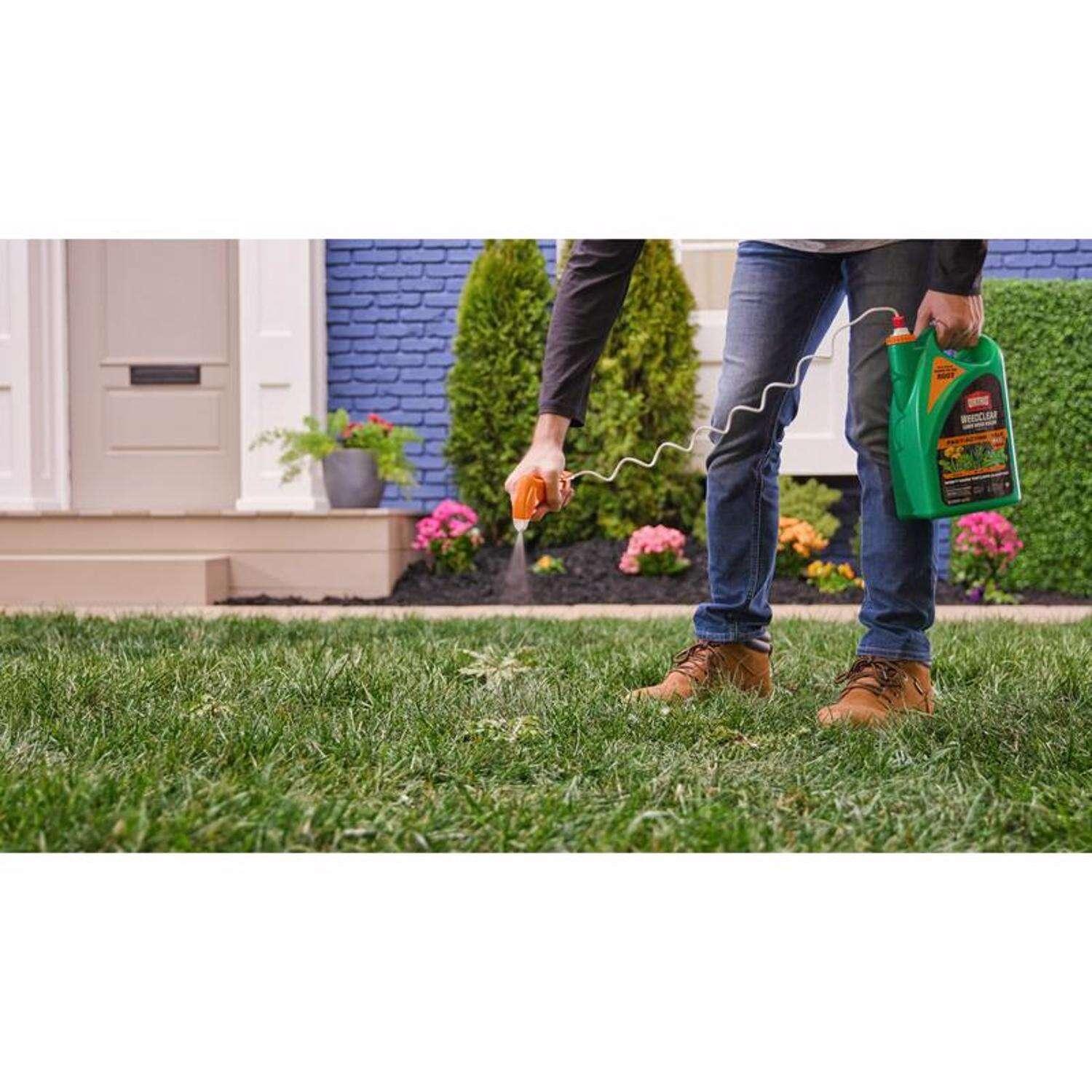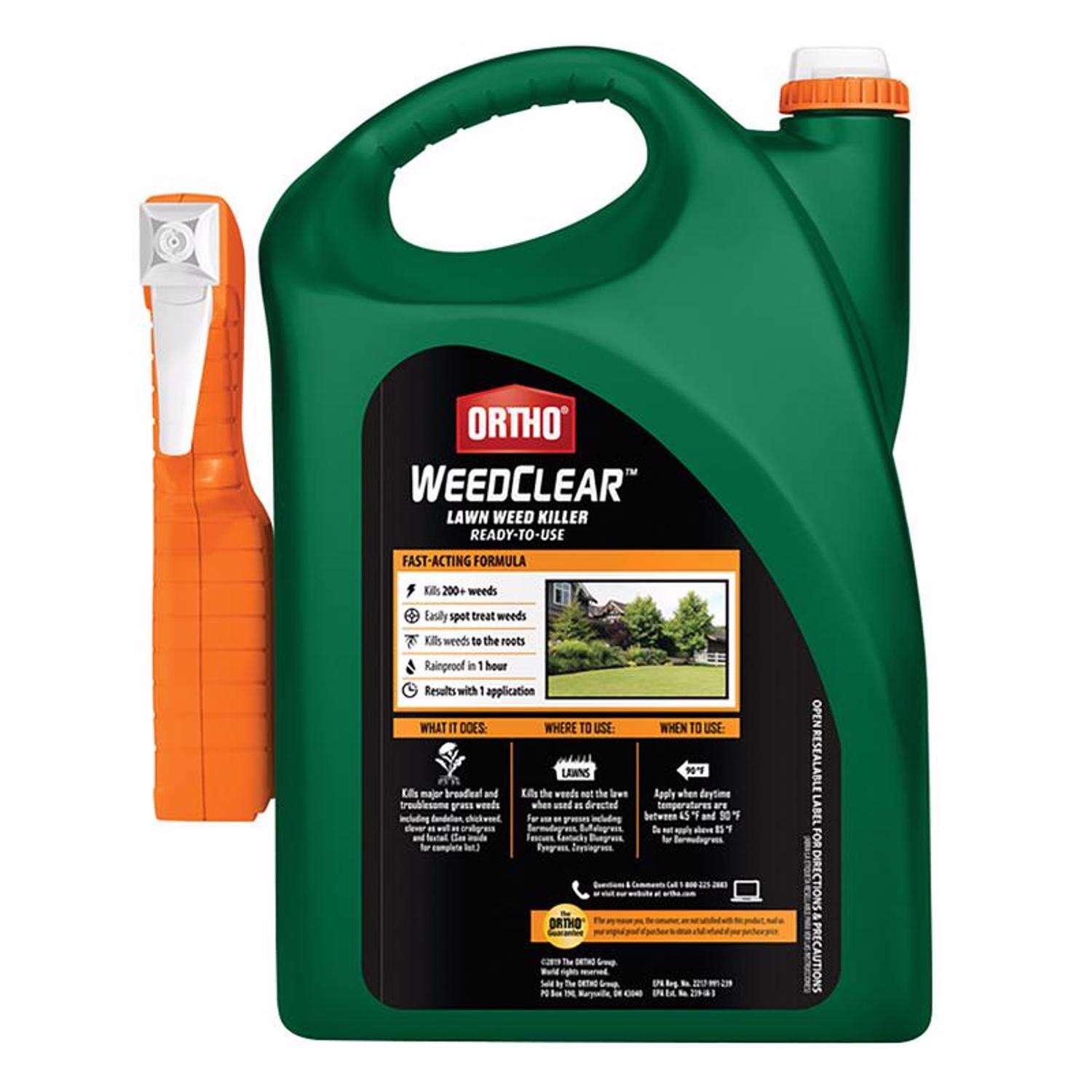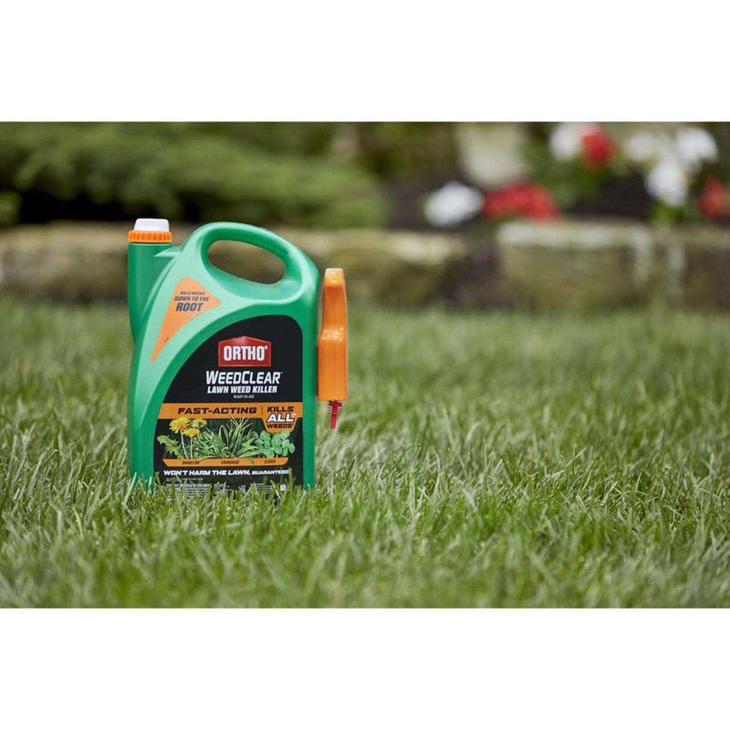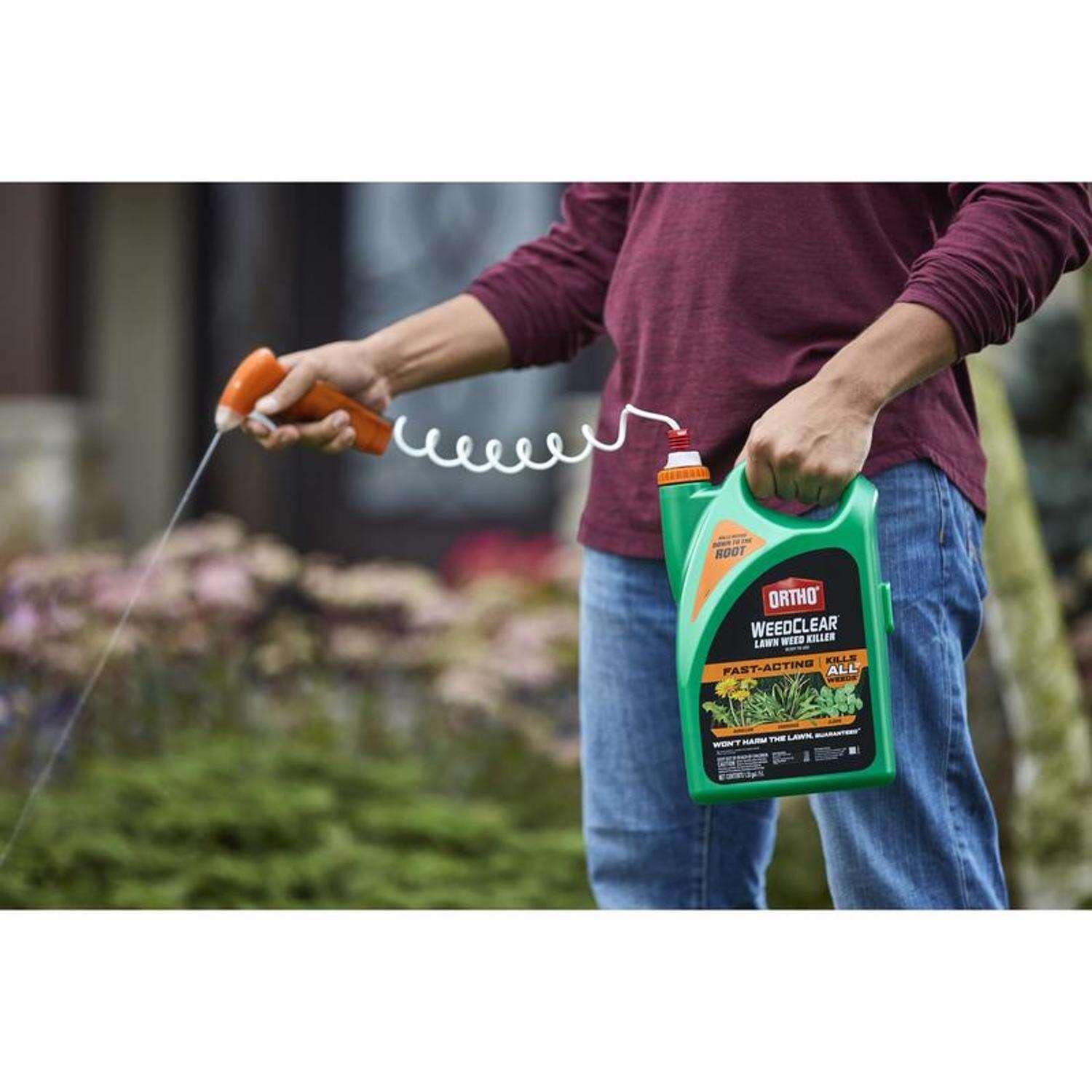 Kill weeds down to the root without harming your lawn (when used as directed)! Ortho WeedClear Lawn Weed Killer Ready-to-Use with Trigger Sprayer kills, controls and suppresses the growth of over 200 types of weeds, all major broadleaf weeds (see label for complete weed list), dandelion, chickweed, clover, crabgrass, signalgrass and foxtail. The fast-acting formula is rainproof in one hour and delivers visible results after just one application. The herbicide is specially formulated to kill weeds all the way down to the roots and won't harm the lawn when used as directed. To use, install the Ortho WeedClear Trigger Sprayer from the side of the bottle and select your desired nozzle setting to easily spot-treat and kill weeds. Apply when weeds are young and actively growing in the spring and fall. It can be applied on multiple lawn and turfgrass varieties, including Bermudagrass, Buffalograss, Tall and Fine fescues, Kentucky Bluegrass, Ryegrass and Zoysiagrass. People and pets may re-enter once treated area has dried.