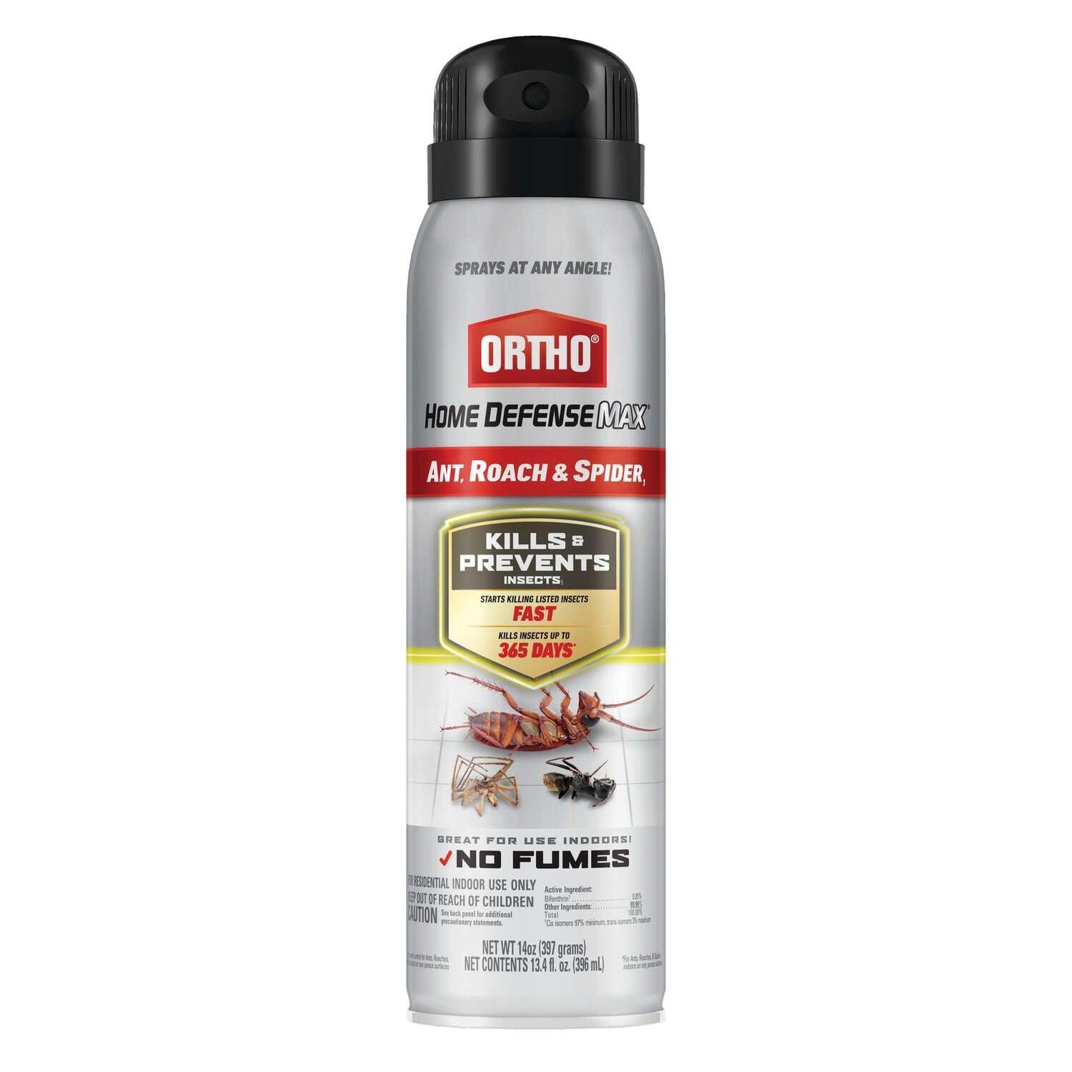 Start to kill ants, roaches, and spiders fast with with Ortho Home Defense Max Ant, Roach & Spider1 spray. The spray produces no fumes, just results. The sprayer works when used at any angle, even upside down. This insect spray kills and prevents ants, roaches, and spiders indoors on nonporous surfaces for up to 365 days. It also kills beetles. With Ortho Home Defense Max Ant, Roach & Spider1 spray, you'll have long-lasting indoor bug control.