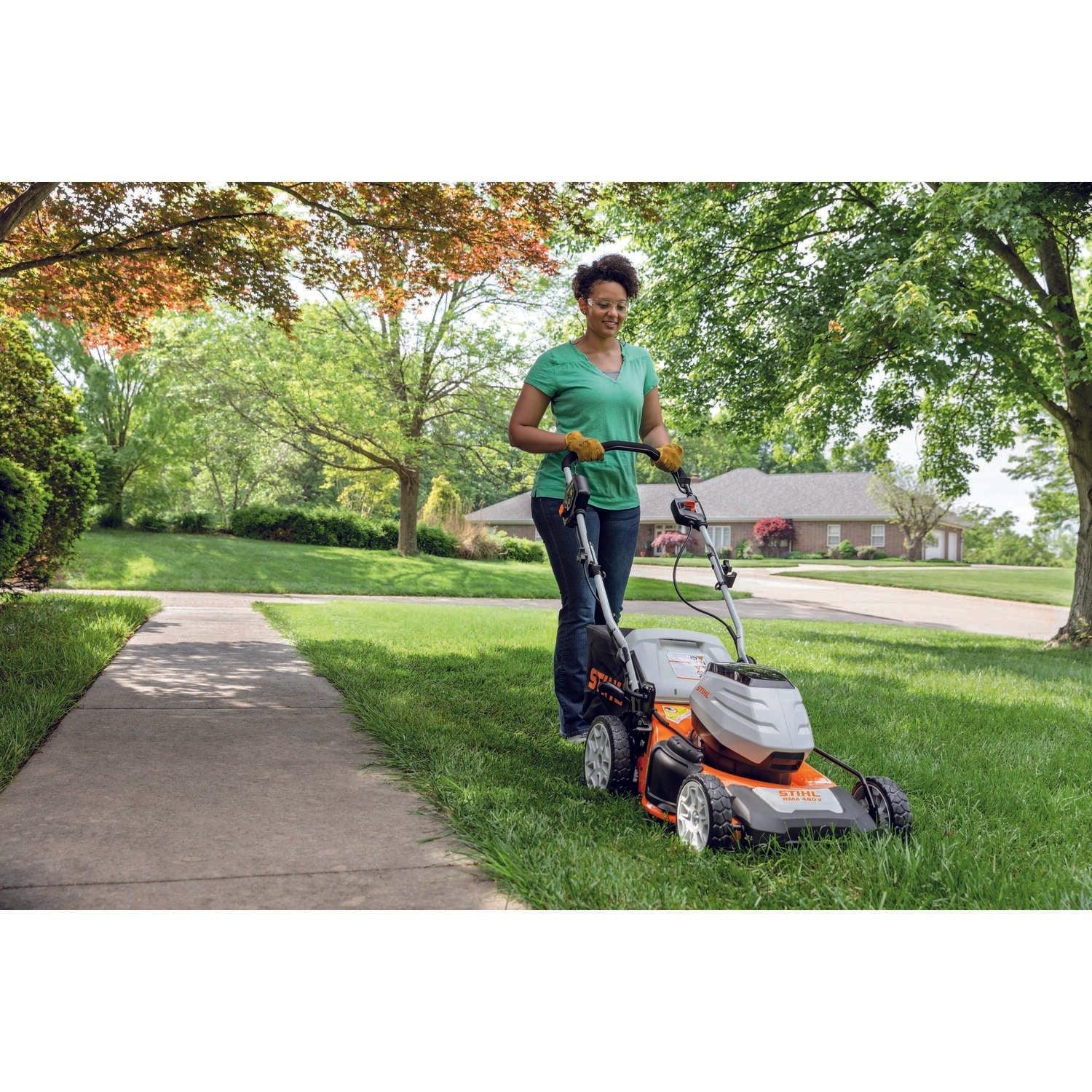 The STIHL RMA 460 V is the first self-propelled lawn mower in the AK Series. Allowing for self-propelling speeds from 0.6 mph to 2.8 mph with the slide of a lever, the RMA 460 V provides smooth and convenient operation that adjusts to conserve energy and optimize run time. With a 19” deck and a 15.85-gallon grass bag, homeowners can enjoy a wide cutting path and the ability to minimize stops needed for emptying. A great fit for small- to medium-sized yards. The RMA 460 V conserves battery and extends run time by automatically reducing power when mowing through light grass and increasing power in taller or thicker grass. Run time may vary based on battery type, charge level and capacity, model, operating style and conditions. Batteries and chargers can be purchased separately or as a combined set with tool.