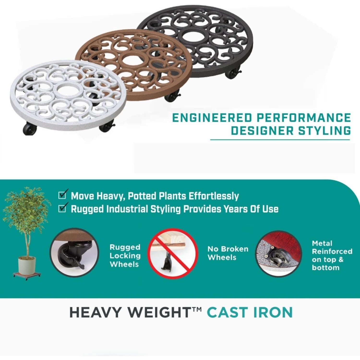 - This "heavy weight" cast iron plant caddy is built for big heavy pots