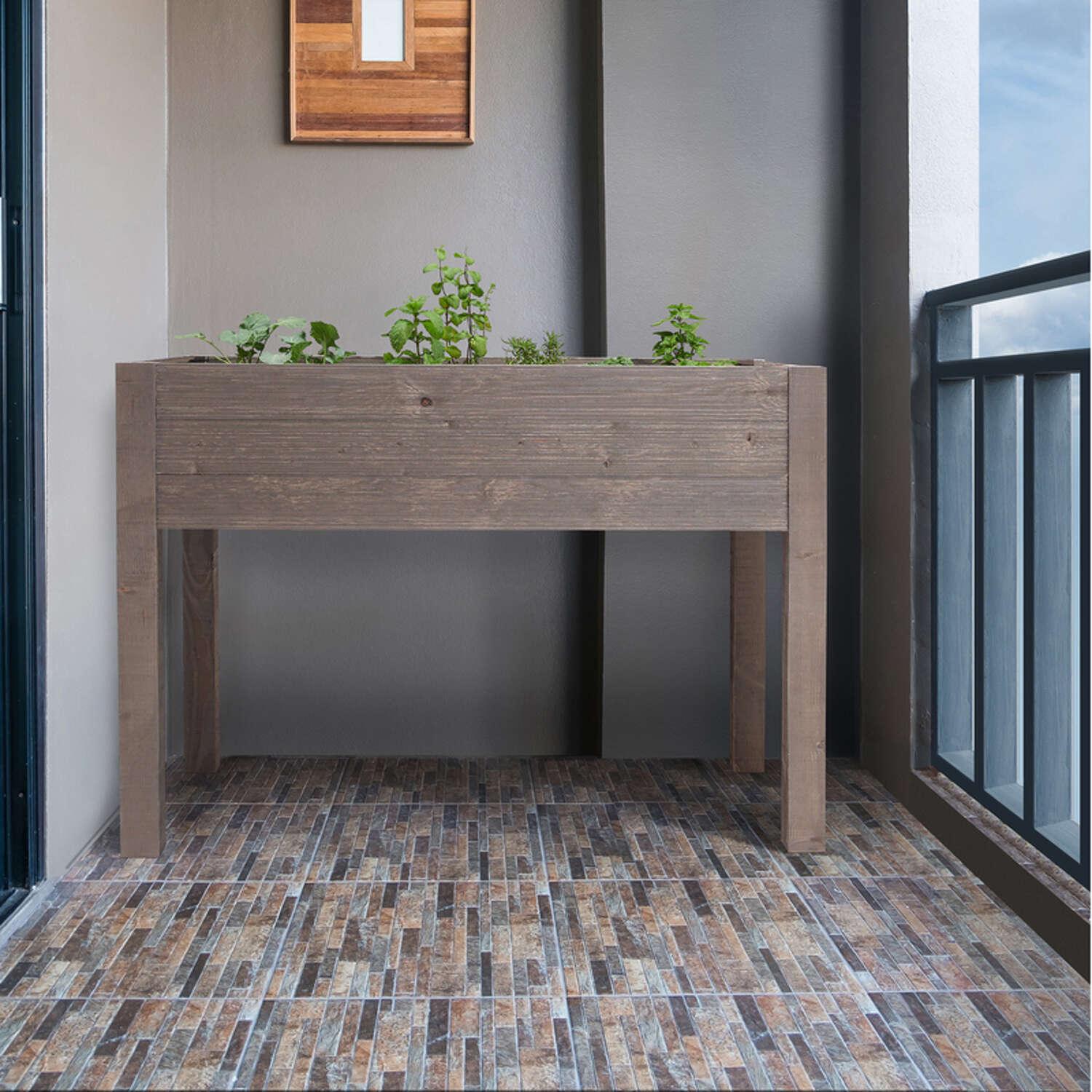 Our Outdoor Essentials Rustic Gray Elevated Garden Planter is a great way to add planting space to your deck, patio or balcony. The 2 ft. x 4 ft. planting box is raised off the ground, so you can tend to your plants without the strain of bending or kneeling. It comes in an easy-to-assemble kit that can be put together in less than 30 minutes. And you don't need any tools. The rustic planter is made with painted rough-sawn lumber to resemble barnwood.