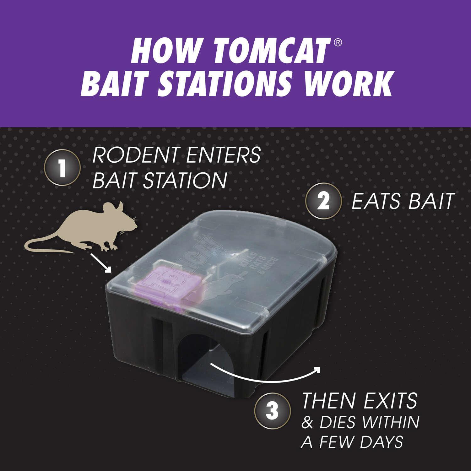 The Tomcat Rat & Mouse Killer Disposable Bait Station - Advanced Formula controls rats and mice with an advanced formulation bait block that is more attractive to house mice (compared to the Tomcat Rat & Mouse Killer Child & Dog Resistant, Disposable Station [EPA Reg. No. 90780-9]). This pre-filled disposable bait station can be used horizontally or vertically inside or outdoors. It is resistant to weather and to tampering by children and dogs. Each 4-oz. block of bait can kill up to 10 rats (based on no-choice laboratory testing). Bait stations with mouse and rat poison should be placed in areas where rats and mice will find them such as beside burrows, along walls, behind kitchen appliances, in corners, along the exterior of the home, and in basements, attics, and garages. If more than one station is being used, place them at 15- to 30-foot intervals. Each Tomcat Rat & Mouse Killer Disposable Bait Station has a clear cover to make it easy to monitor when bait has been taken.