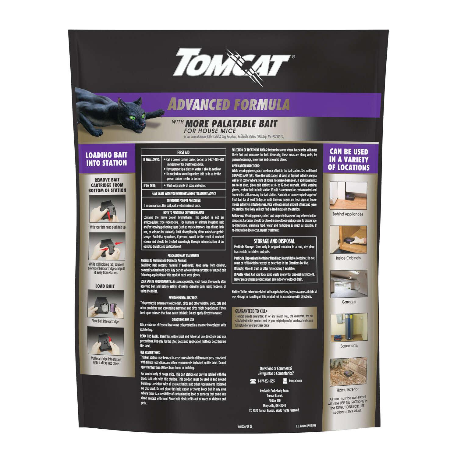 The Tomcat mouse killer refillable bait station - advanced formula controls mice with an advanced formulation bait block that is more attractive to house mice (compared to our Tomcat mouse killer child & dog resistant refillable station [EPA Reg. No. 90780-10]). This Tomcat mouse bait station can be placed indoors or outdoors and it's resistant to weather and tampering by children and dogs. Bait stations with mouse poison should be placed beside burrows, along walls, behind kitchen appliances, inside cabinets, in garages and basements and along the exterior of the home. If more than one station is being used, place them at 8 to 12-foot intervals. Mice will likely eat a small portion of the bait and then leave the station.