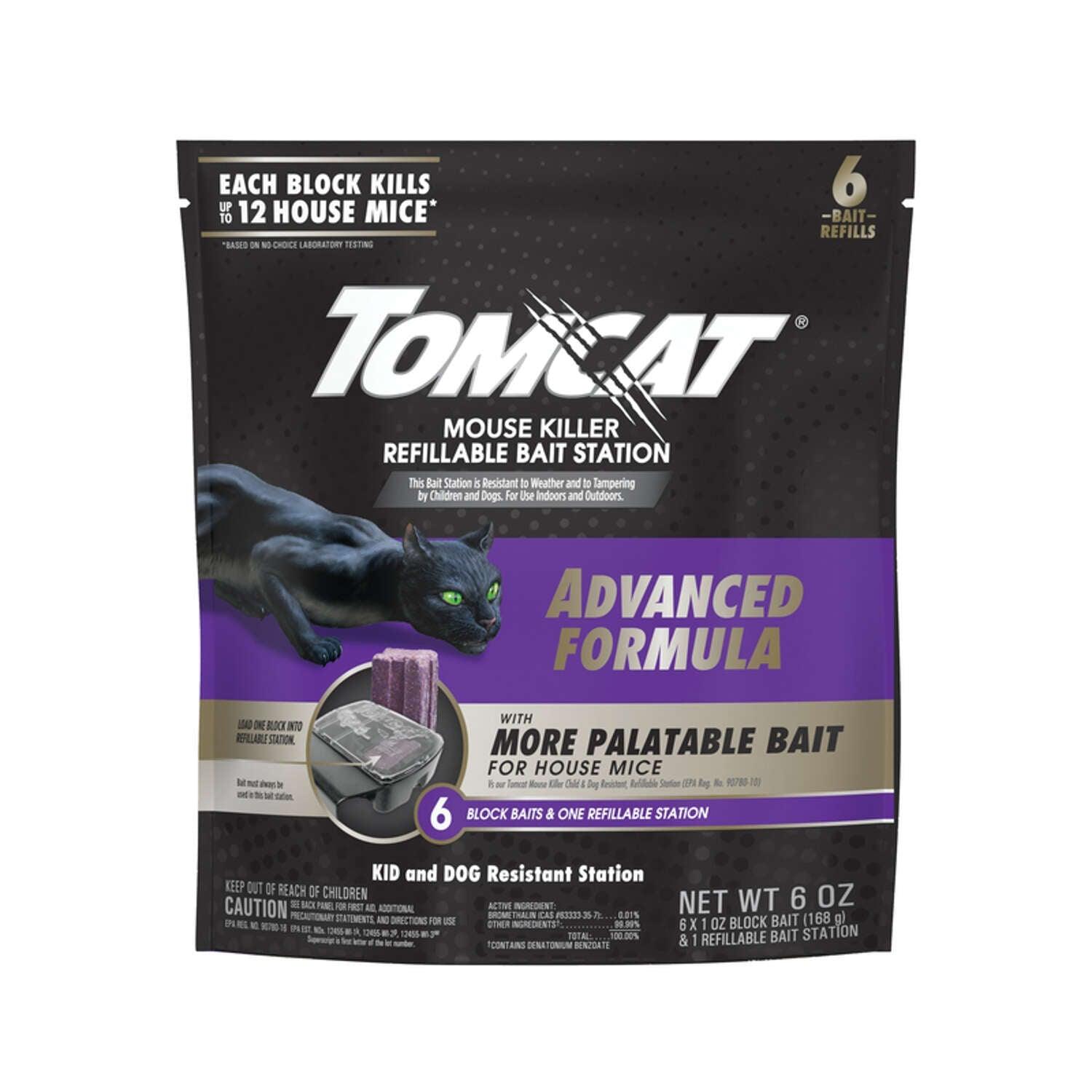 The Tomcat® Mouse Killer Refillable Bait Station - Advanced Formula controls mice with an advanced formulation bait block that is more attractive to house mice (compared to our Tomcat Mouse Killer Child & Dog Resistant Refillable Station [EPA Reg. No. 90780-10]). This Tomcat® mouse bait station can be placed indoors or outdoors and it's resistant to weather and tampering by children and dogs. Each block of bait can kill up to 12 house mice (based on no-choice laboratory testing) and each package contains six blocks. Bait stations with mouse poison should be placed beside burrows, along walls, behind kitchen appliances, inside cabinets, in garages and basements, and along the exterior of the home. If more than one station is being used, place them at 8- to 12-foot intervals. Mice will likely eat a small portion of the bait and then leave the station. The Tomcat® Mouse Killer Refillable Bait Station - Advanced Formula has a clear cover to make it easy to monitor the bait block. When there is no more bait in the station, easily refill it with one of the provided bait blocks (only use one at a time).